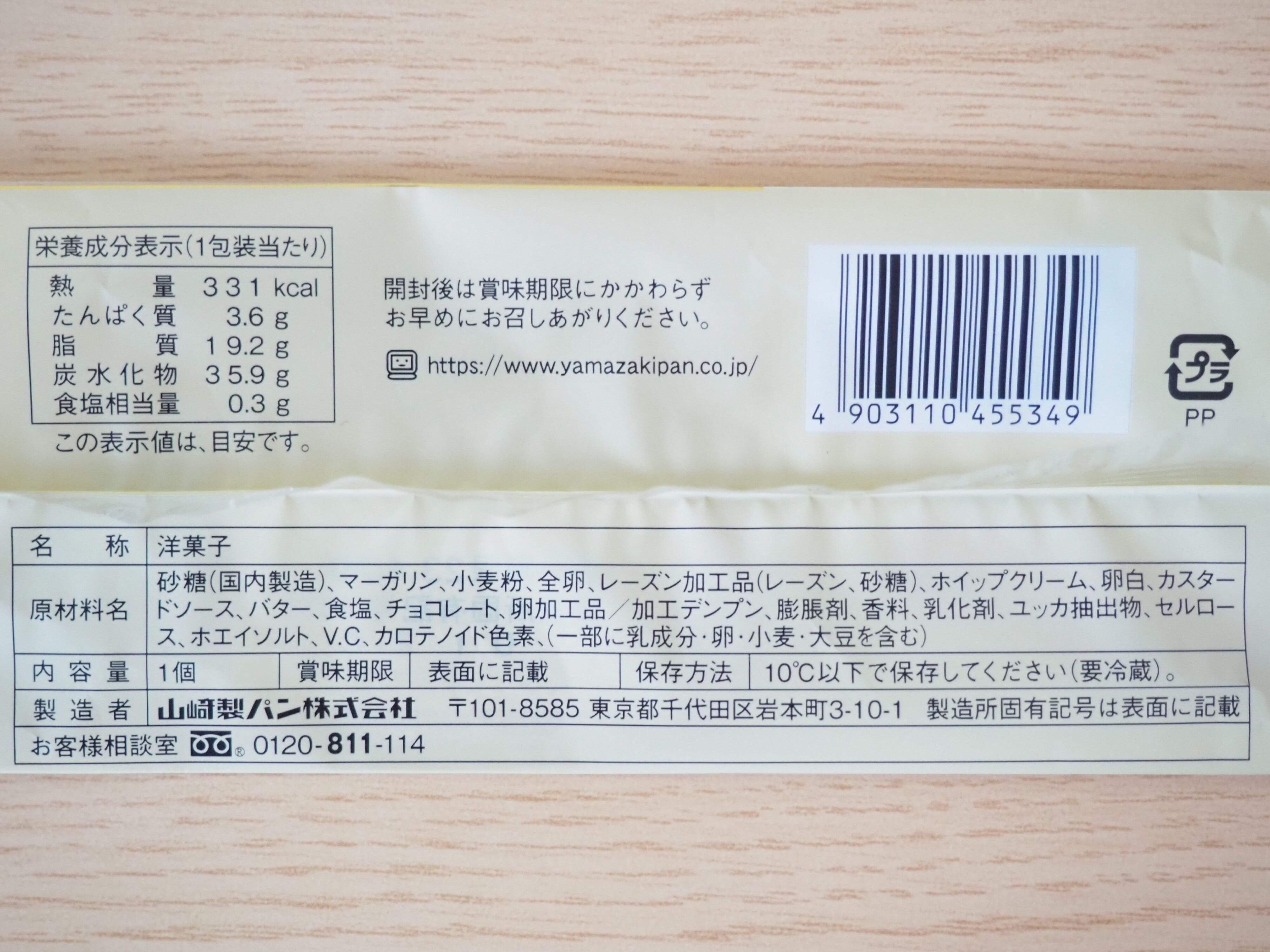 製造を担当するのは山崎製パンで、カロリーは331kcal。原材料名を見てみると、確かにお酒は入っていないようです。