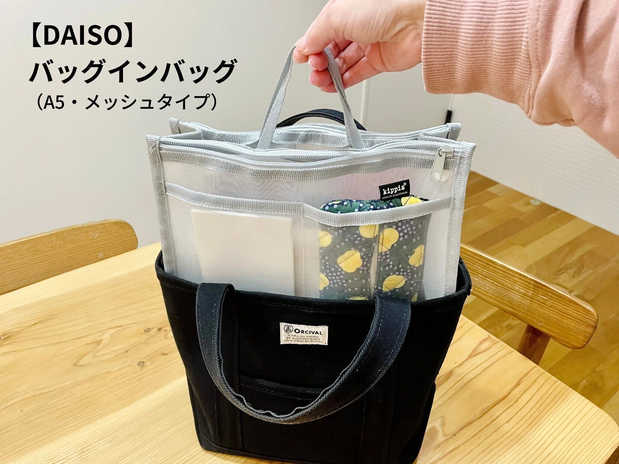 カバンの整理に使っているのは、【ダイソー】バッグインバッグ(A5サイズ・メッシュ)。グレー×メッシュのシンプルなデザインです。