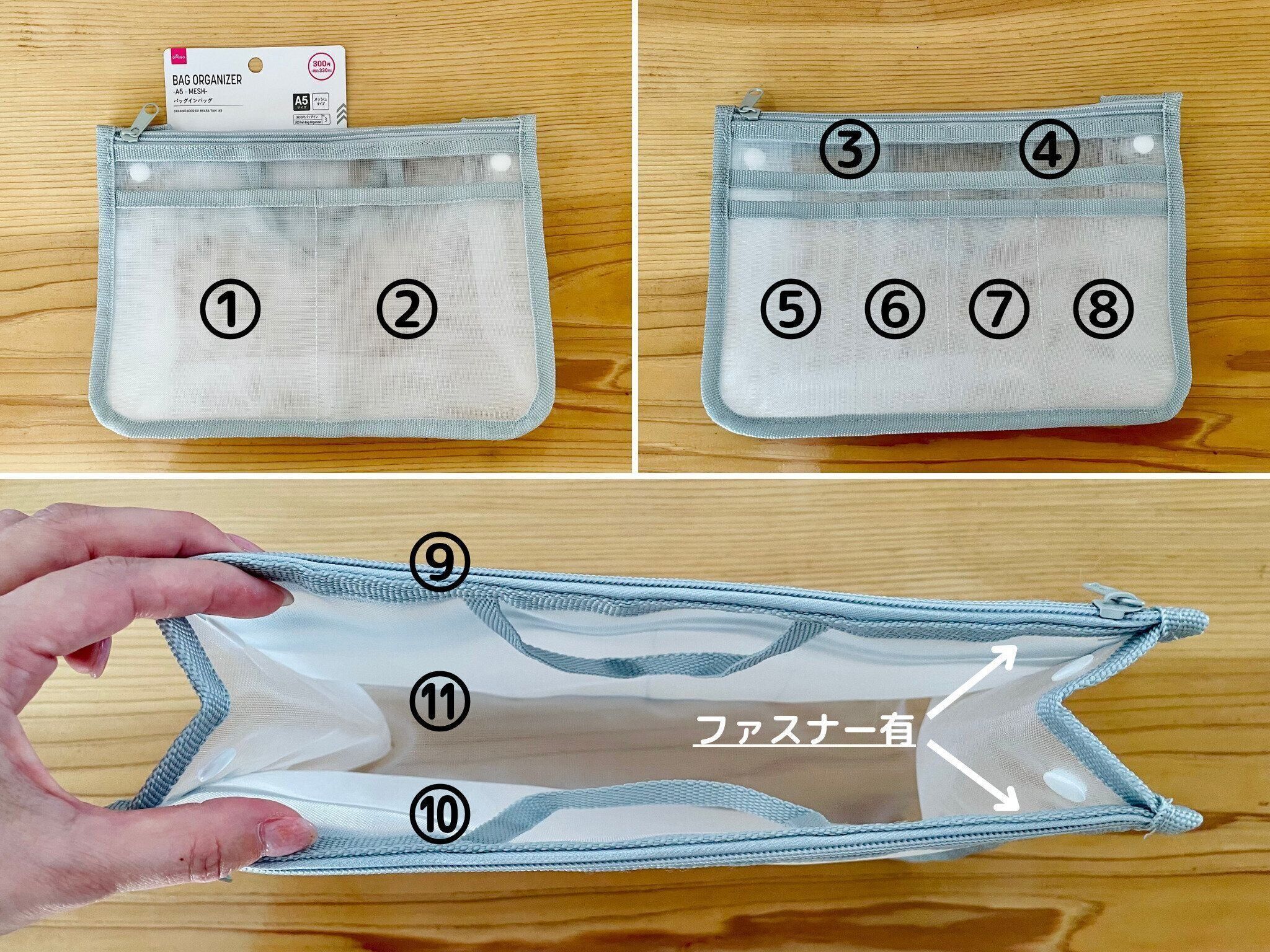 ダイソーのアイテム1つで、スッキリ探しやすいカバンがつくれますよ。