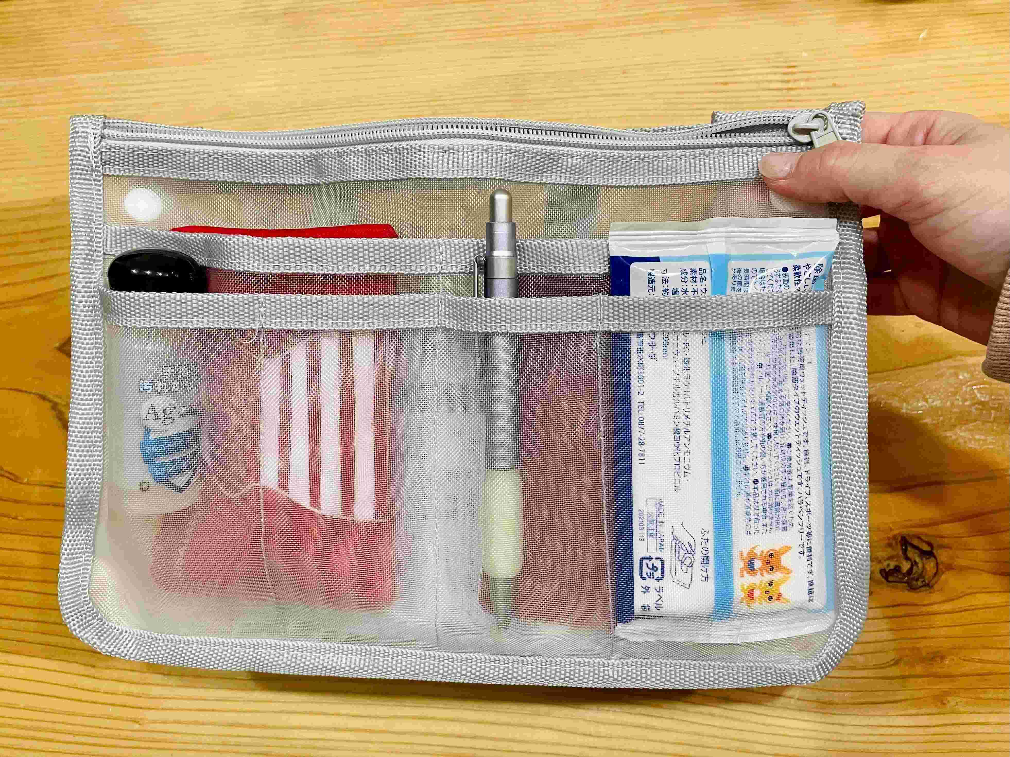 いつも持ち歩くものを入れてみました。当たり前ですが、メッシュなので中が丸見え。この「丸見え」が最高に使いやすいんです!