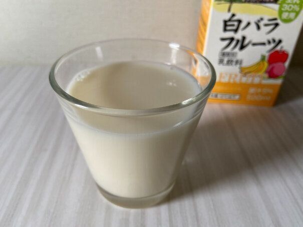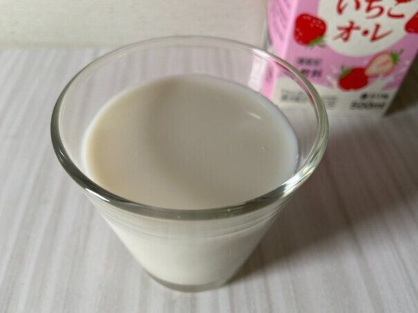 グラスに注いでみてびっくり、ピンク色を想像していましたがほぼ牛乳と変わらないほどの白い見た目です。