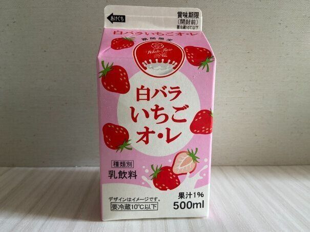 おいしくなって新登場「白バラいちごオ・レ」(購入時:220円)は昨年より濃厚さがアップしているとのこと。