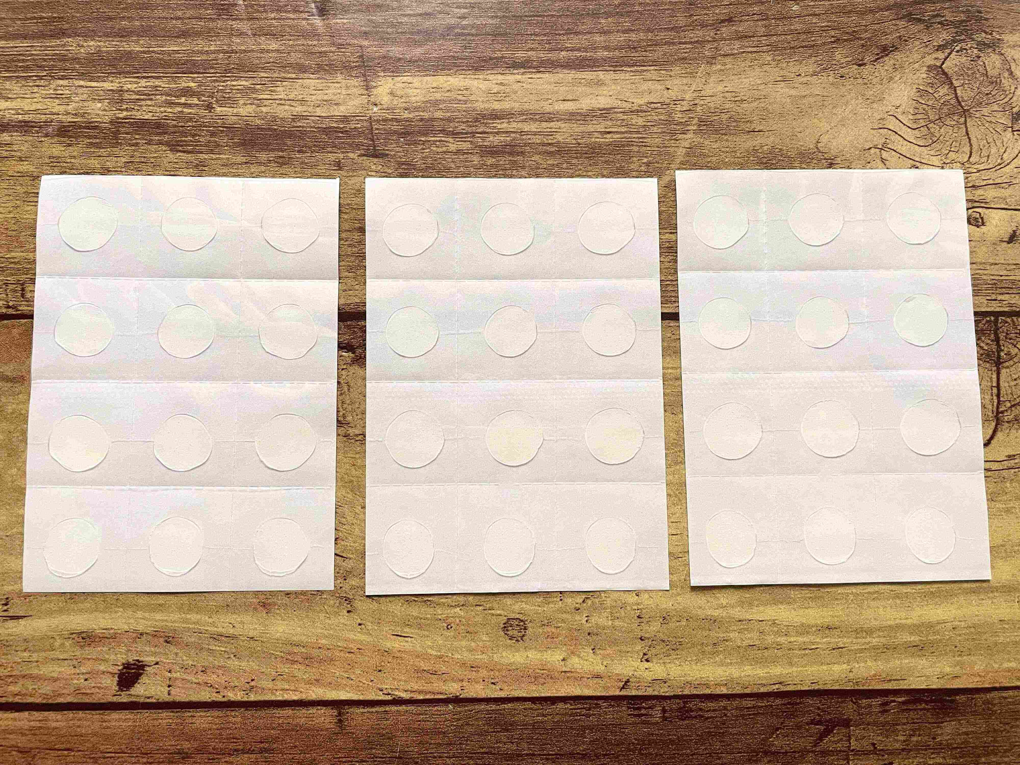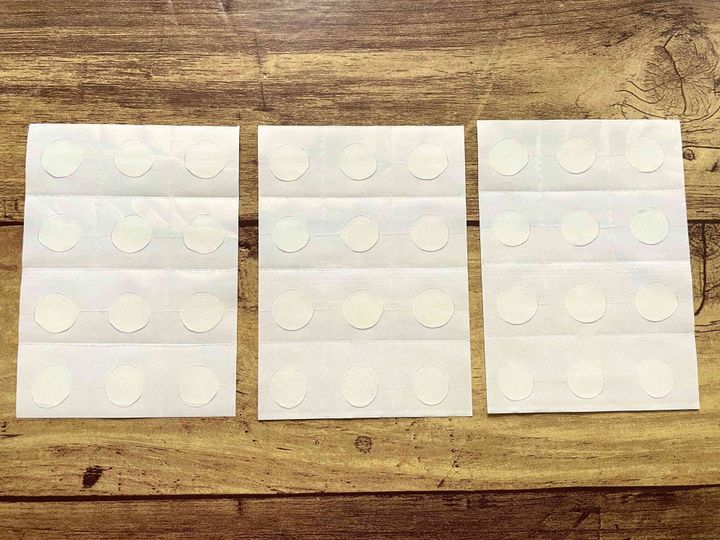 ご紹介するのは、ワッツの「押しピンがわりに両面粘着ジェルシール12mm」です。36個入りで価格は110円。