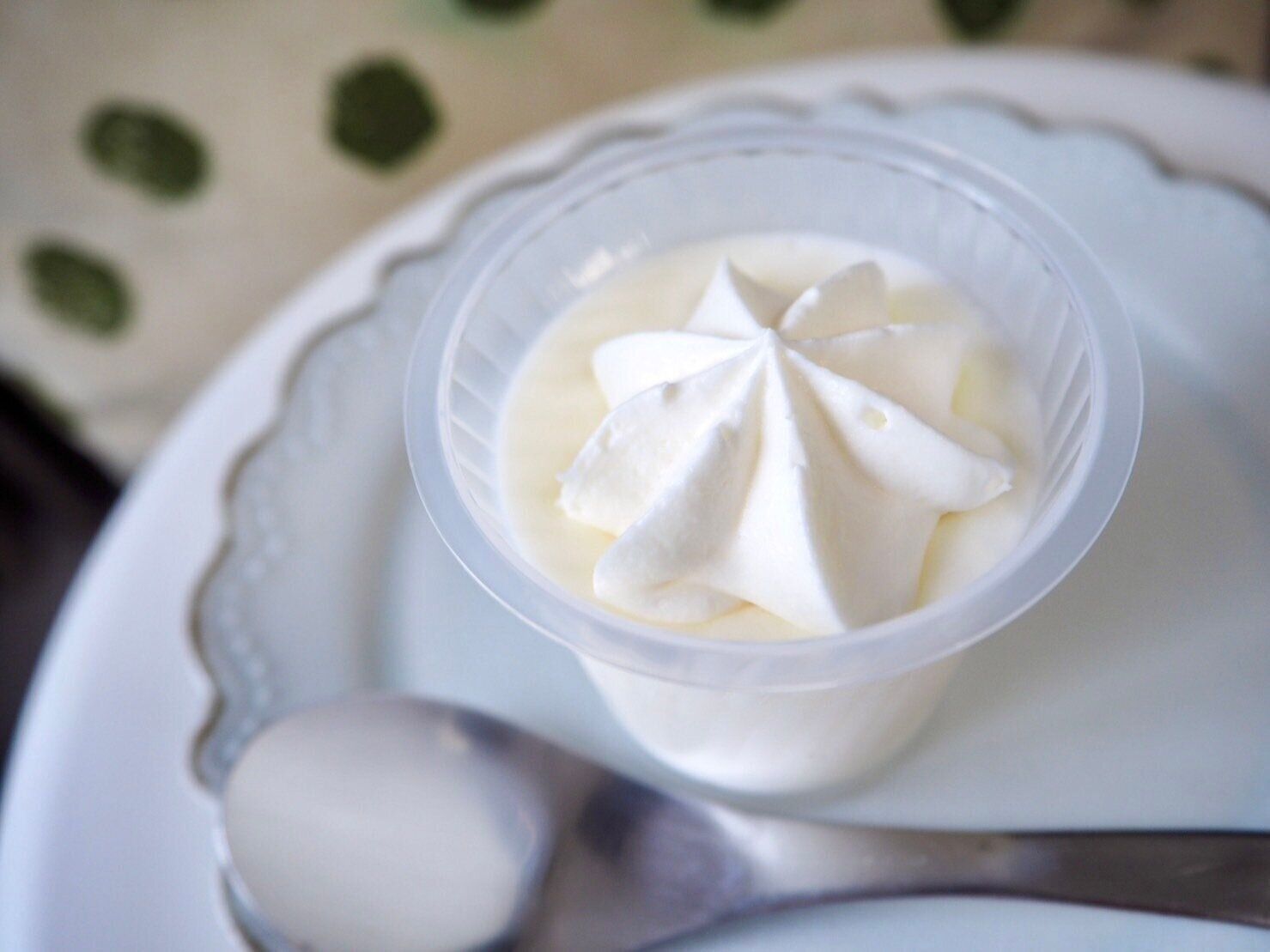 真っ白な牛乳プリンの上に、たっぷりのホイップクリームがしぼってあります。