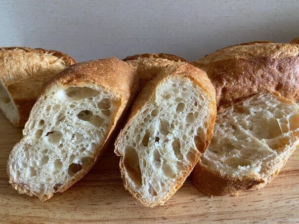 パリパリの香ばしいクラスト、気泡がしっかりあって噛みしめるたびに感じる甘みと小麦の香りがたまりません。