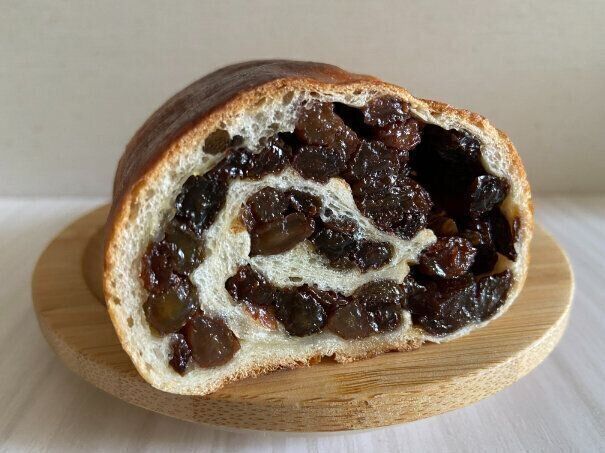 レーズンを限界まで巻いて焼き上げた、レーズンぎっしりなパンです。1.5~2cmくらいの厚さにスライスして軽くトーストして食べるともっちりやさしい甘みの生地にじゅわっとフルーティーなレーズンが最高でした。