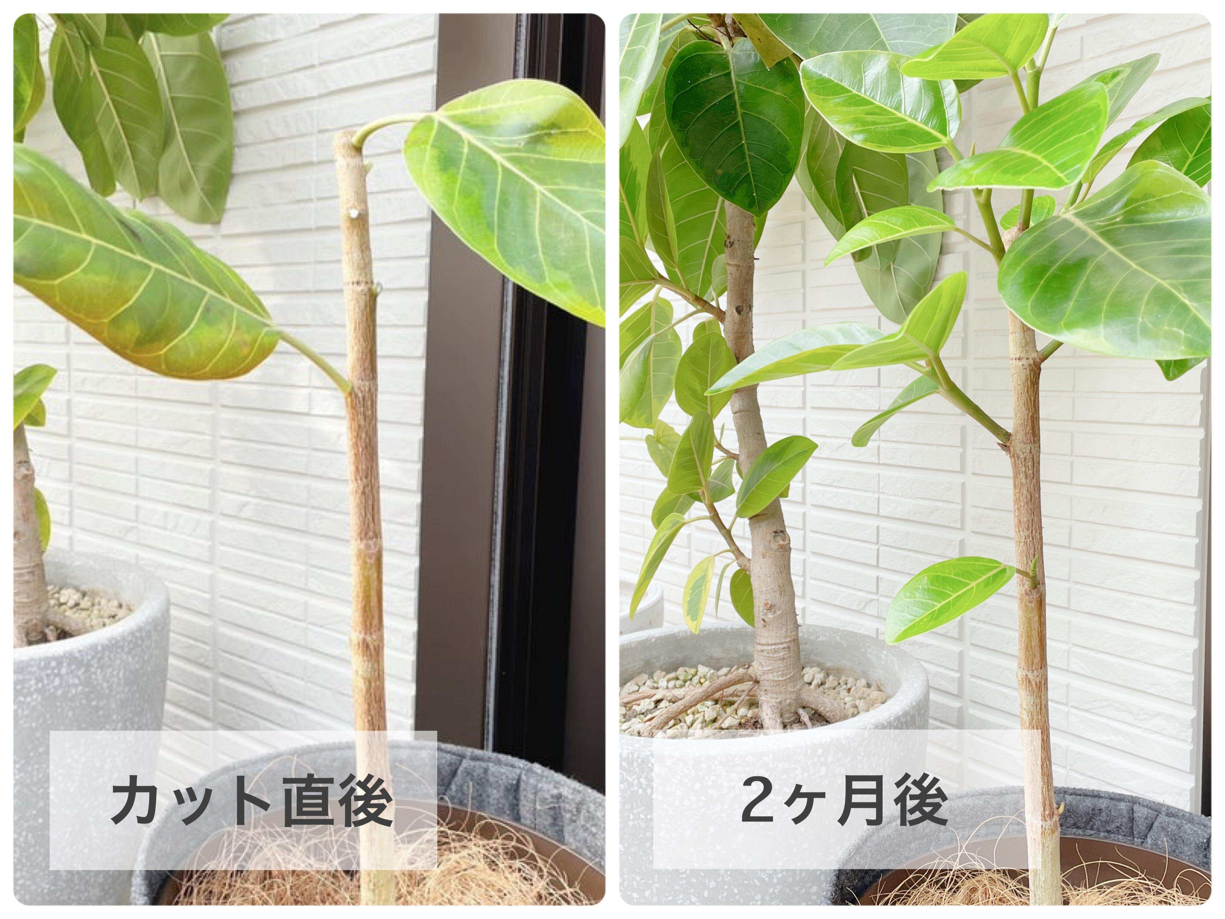 葉色がなんだかくすんで見える、葉焼けしてしまった、ひょろひょろと長くなって枝が太くならない。そんな風に感じる時は思い切って葉 or 枝をカット!カットする時期にもよりますが、葉を1~2枚残して丸坊主にしても大体1~2カ月で綺麗な葉をつけ始めて復活してきます。