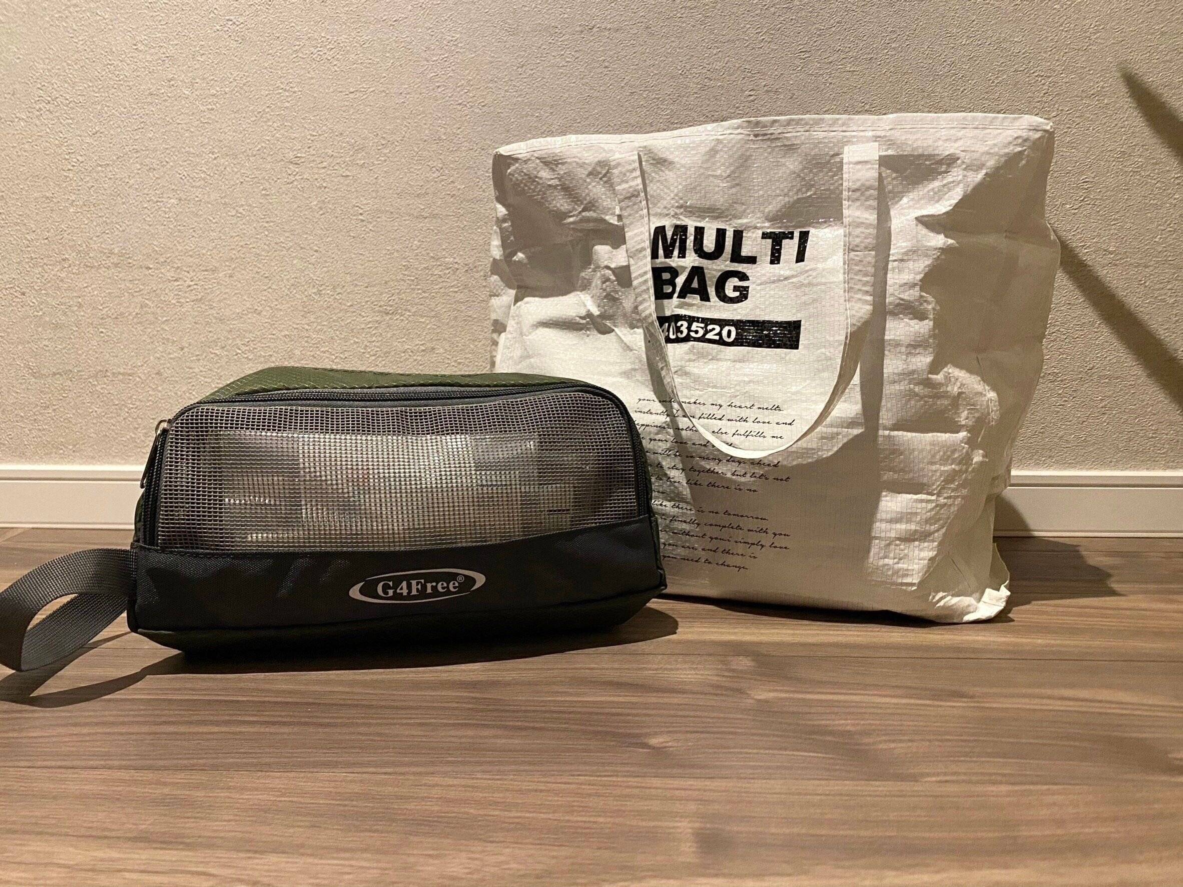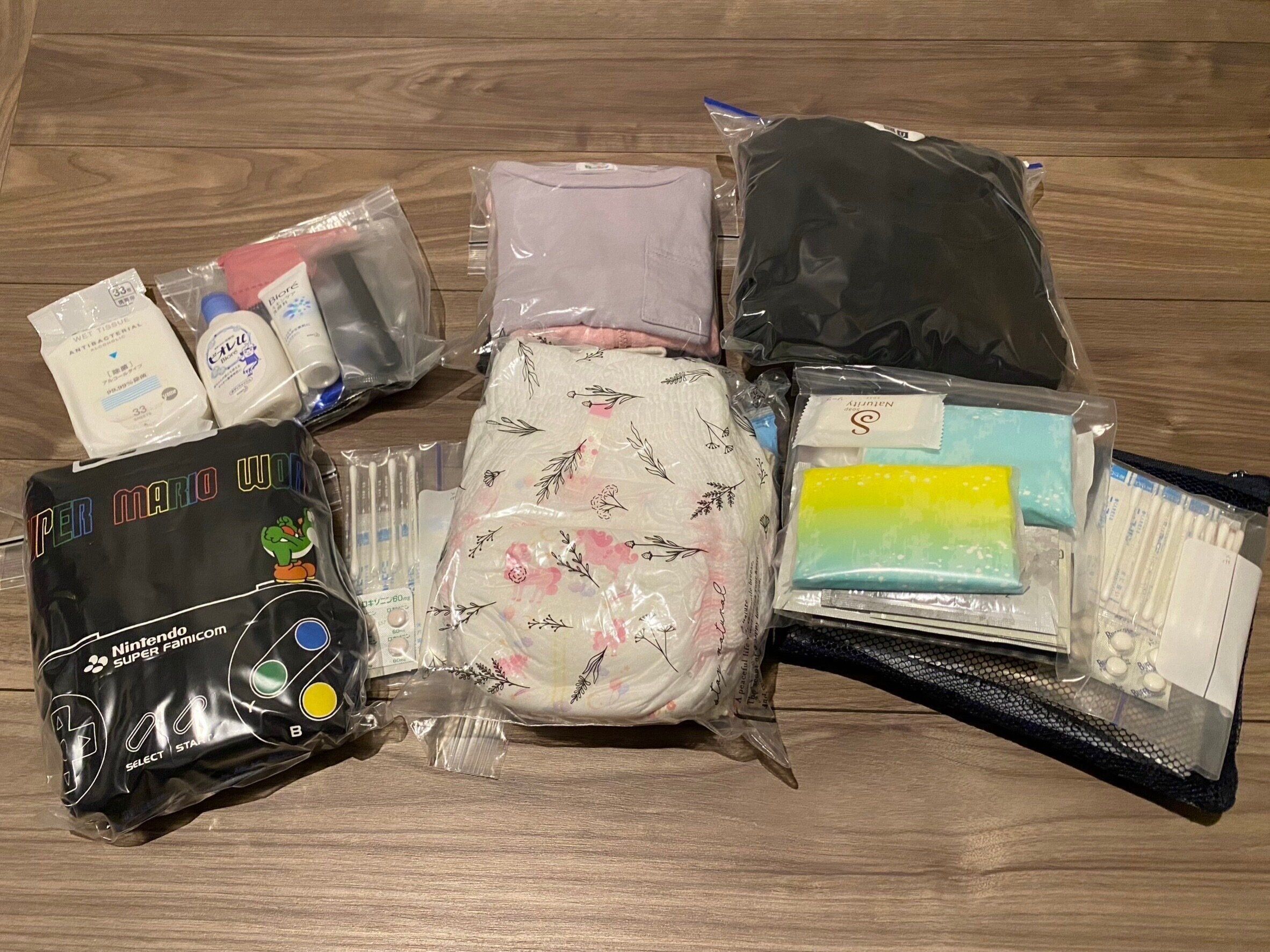 オムツや着替え一日分、私の洗面用具など。タオルやミニ絵本やストロー、歯磨きシートなどは、普段のお出かけバッグに入っているので、ここでは省略しました。