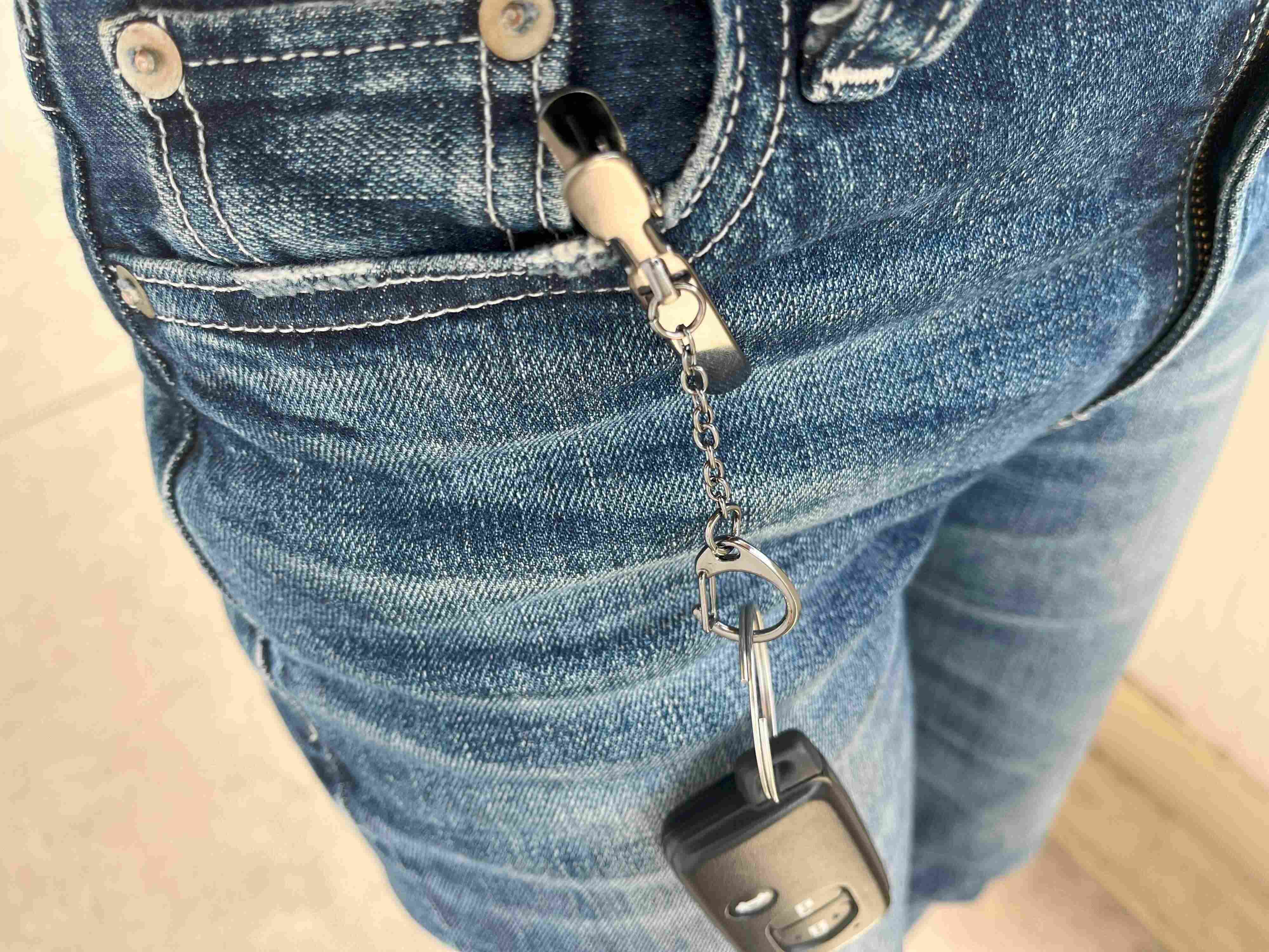 古紙のごみ出しなどで両手がふさがる時にもポケットから落ちる心配なくカギを持ち運べますよ。