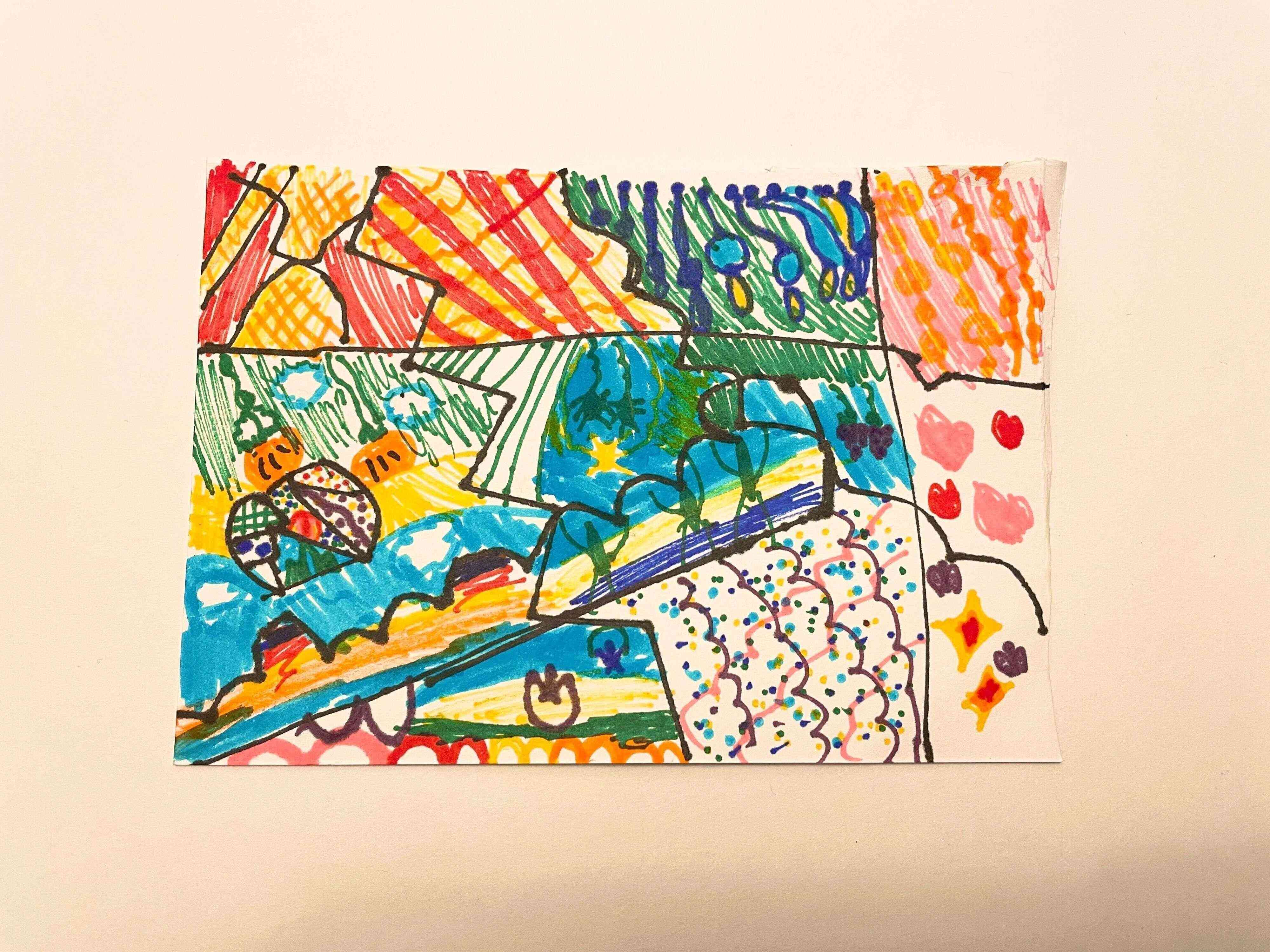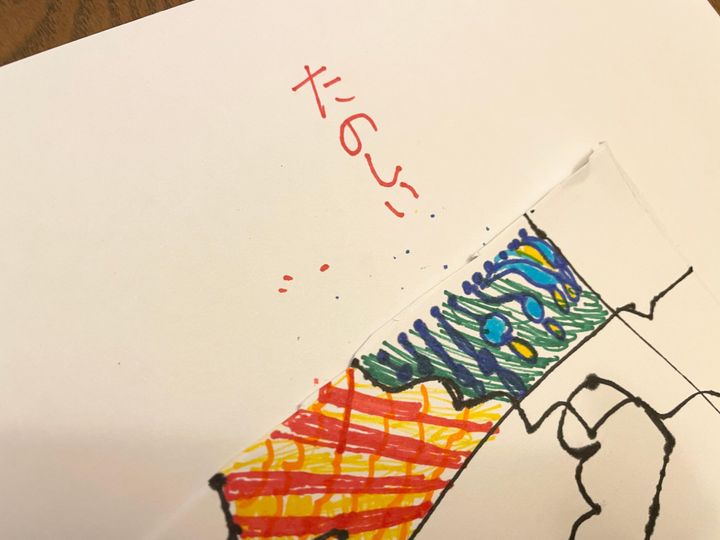 娘は今回のアート体験がとても楽しかったようで、画用紙のはじに「たのしい」と書いていました。それを見てなんだかほっこり。