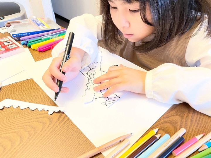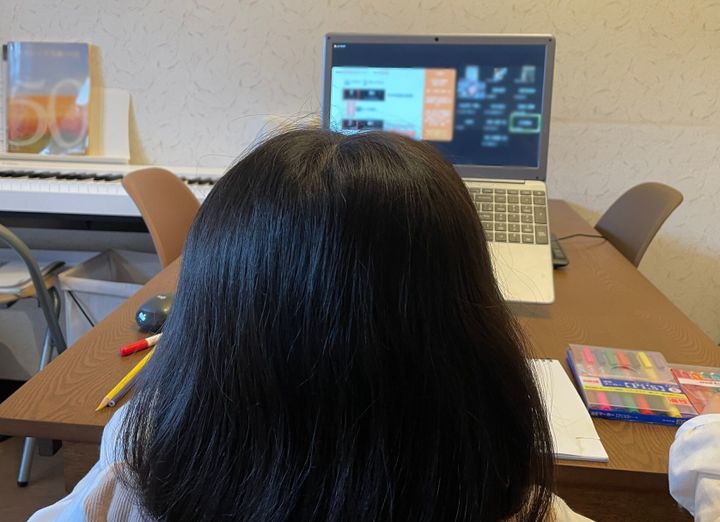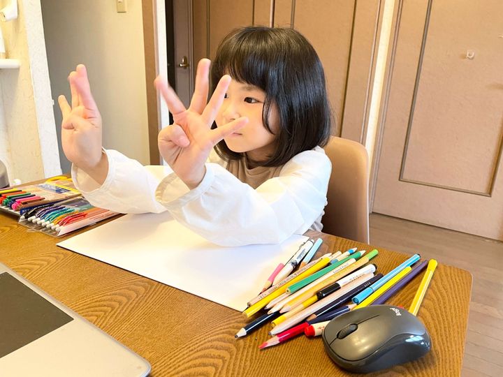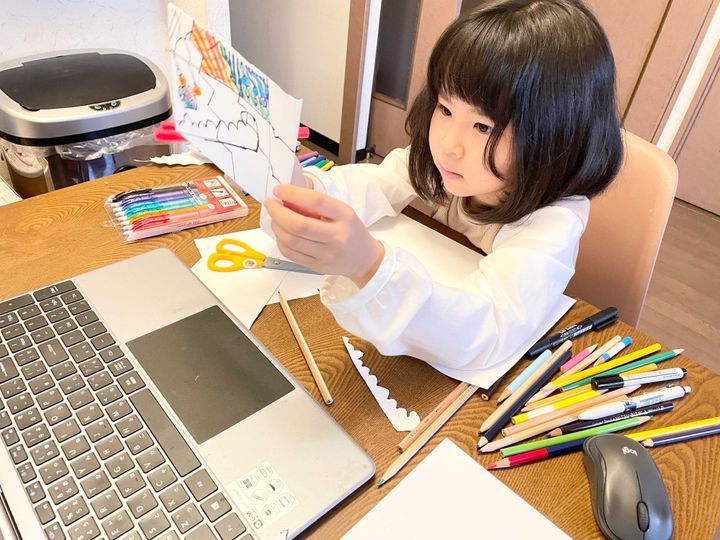 お絵描きが大好きな娘はアートを選択。Zoomを使ったオンラインレッスンなので、自宅からの参加です。