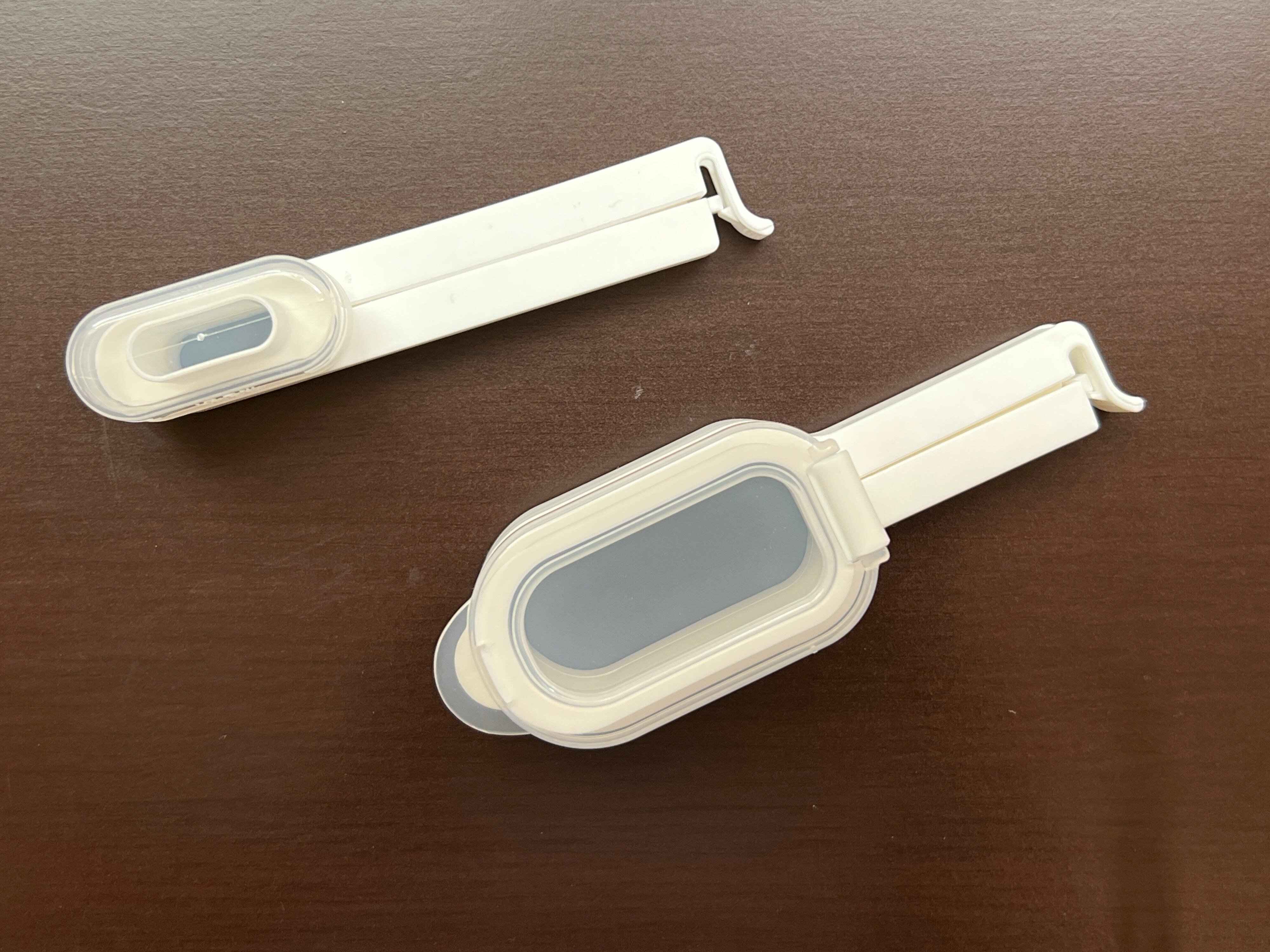 100均でよく見るこの類のクリップは、注ぎ口とクリップのパーツが分かれているものがほとんどですが、この袋クリップは一体型。取りつけがとても楽です!