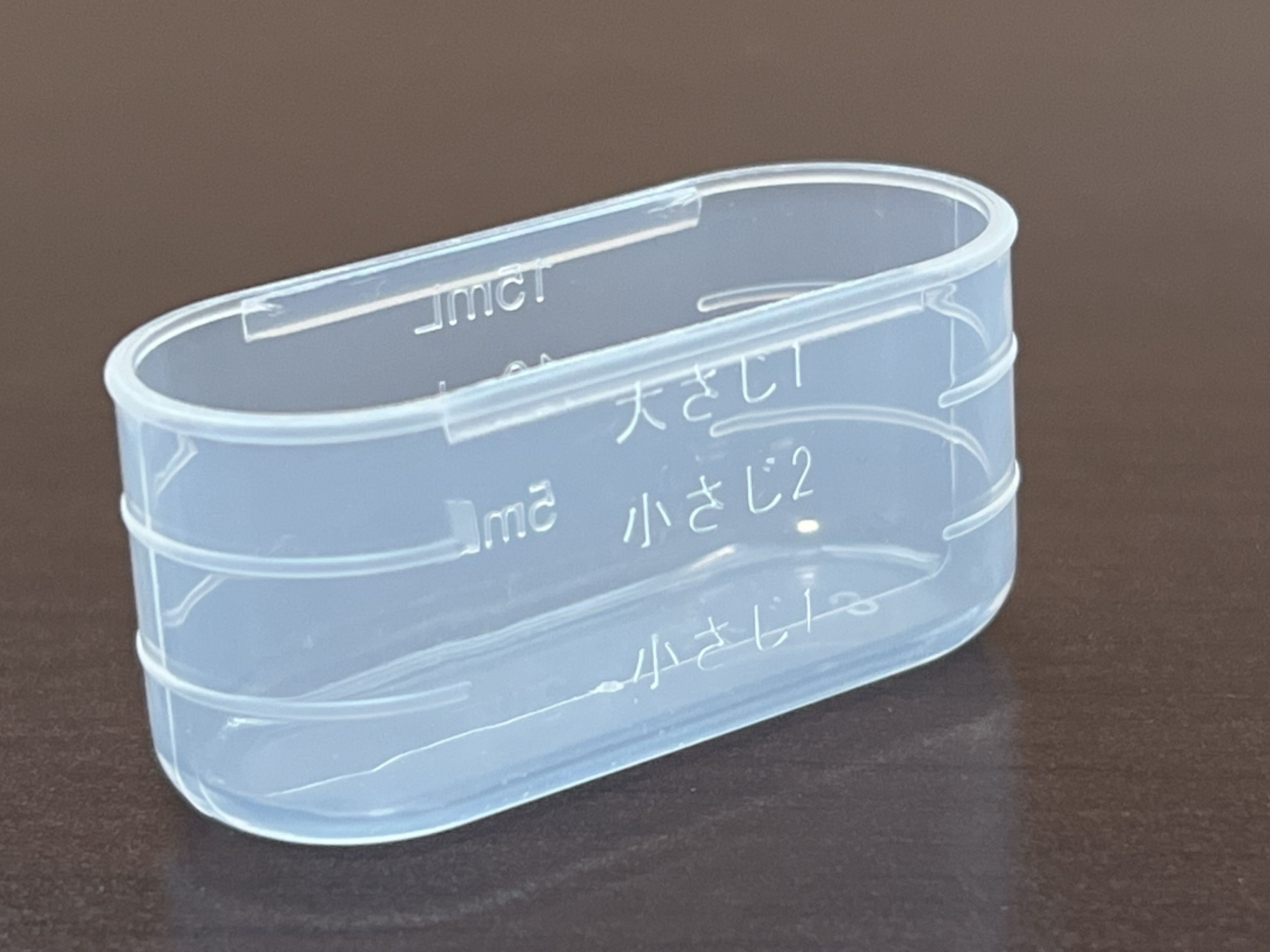フタは計量目盛りつきで小さじ1(約5ml)・小さじ2(約10ml)・大さじ1(約15ml)が量れます。