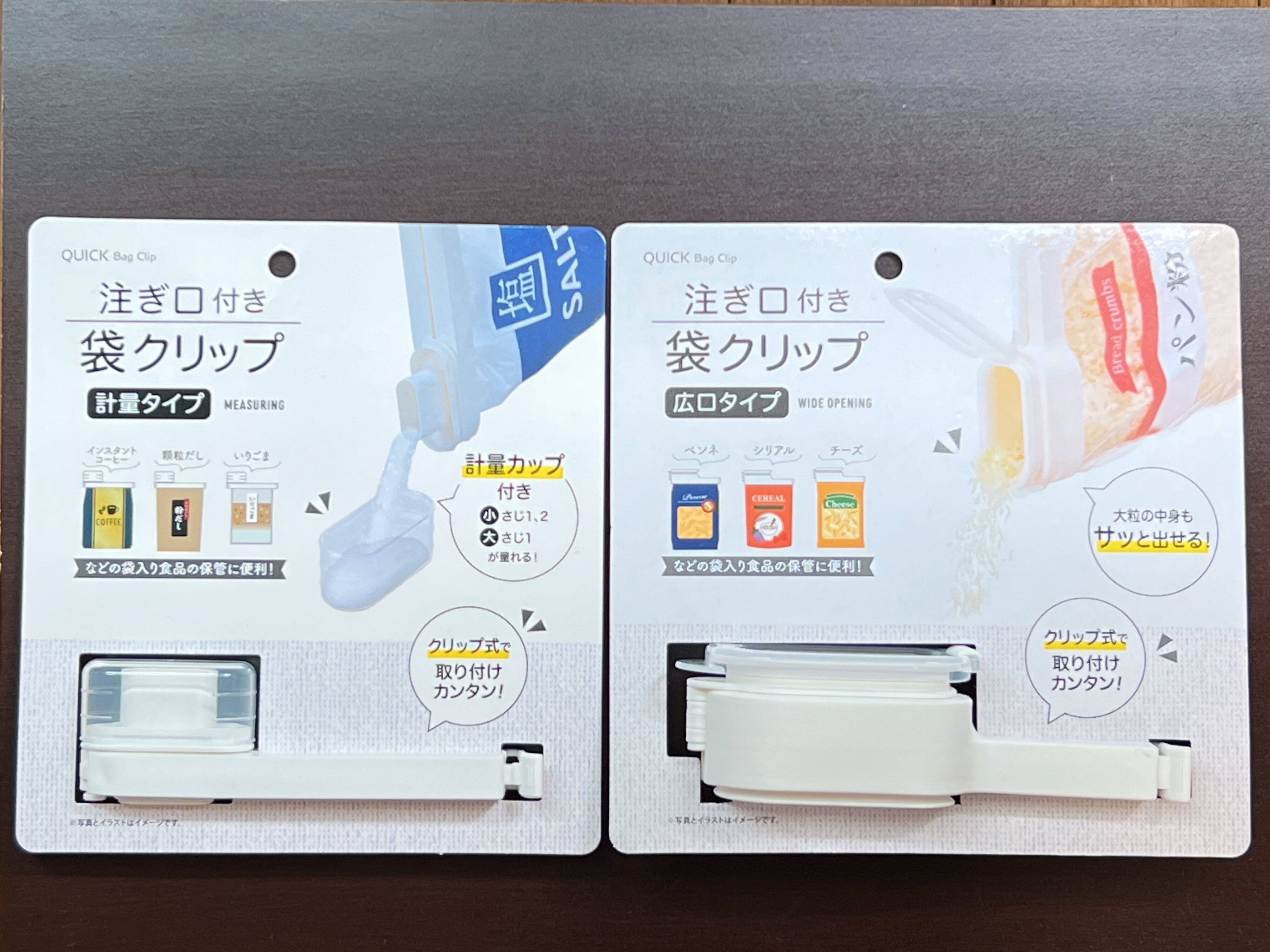 セリアの「注ぎ口付き袋クリップ」は2タイプの商品展開。広口タイプはペンネやシリアル、チーズ等の袋の保管に向いており、計量タイプはインスタントコーヒーや顆粒だし、いりごまなどの袋の保管に便利です。