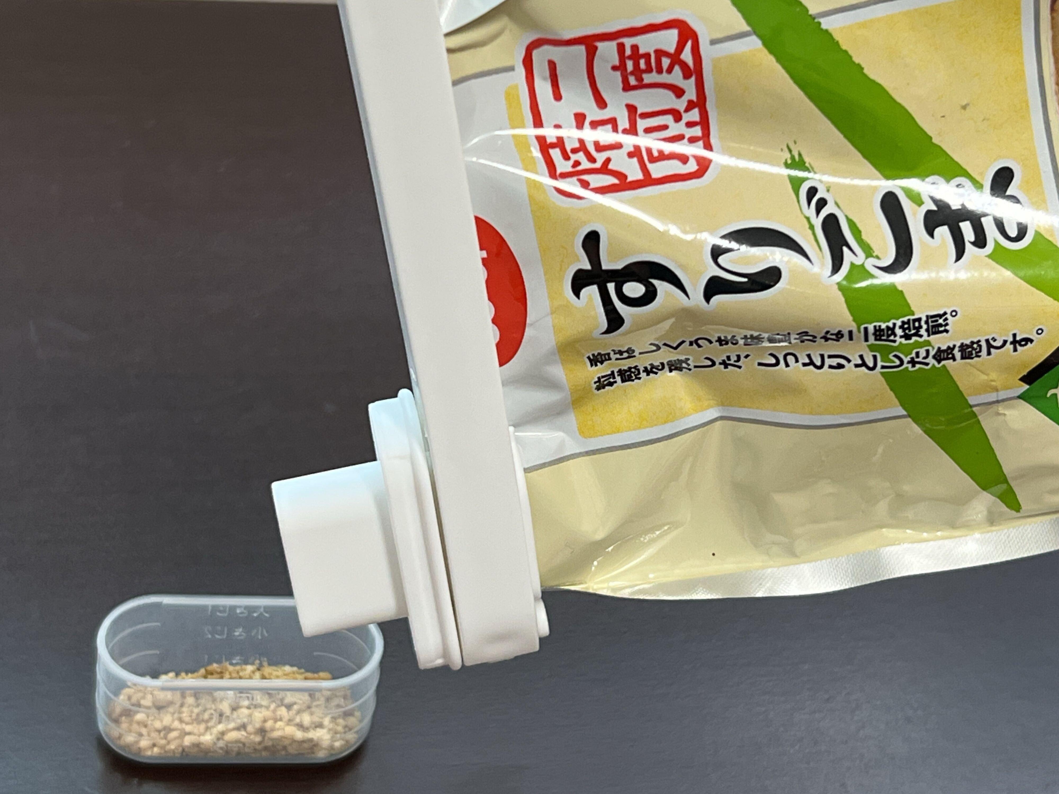 袋にチャックがついていない場合、別の保存容器に移し替えるのはちょっと面倒臭いですが、このセリアの「注ぎ口付き袋クリップ」を使えば格段に楽になるのでぜひ使ってみてください。