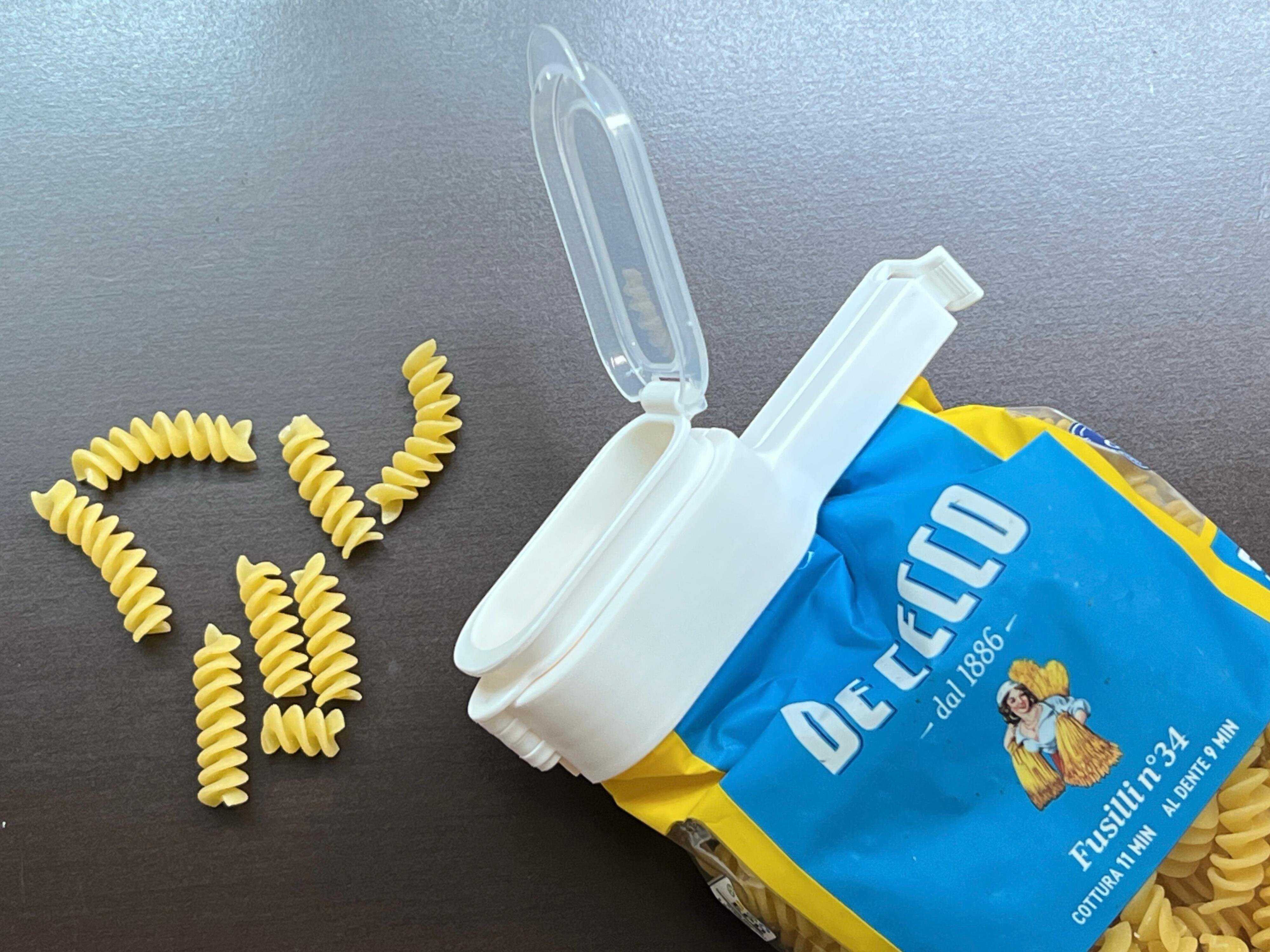 パスタの袋もチャックがついていないので、この袋クリップがとても便利です。朝や夕方のキッチンはバタバタしがちですが、フタを開いてそのまま注ぐだけだと時短にも繋がりますね。
