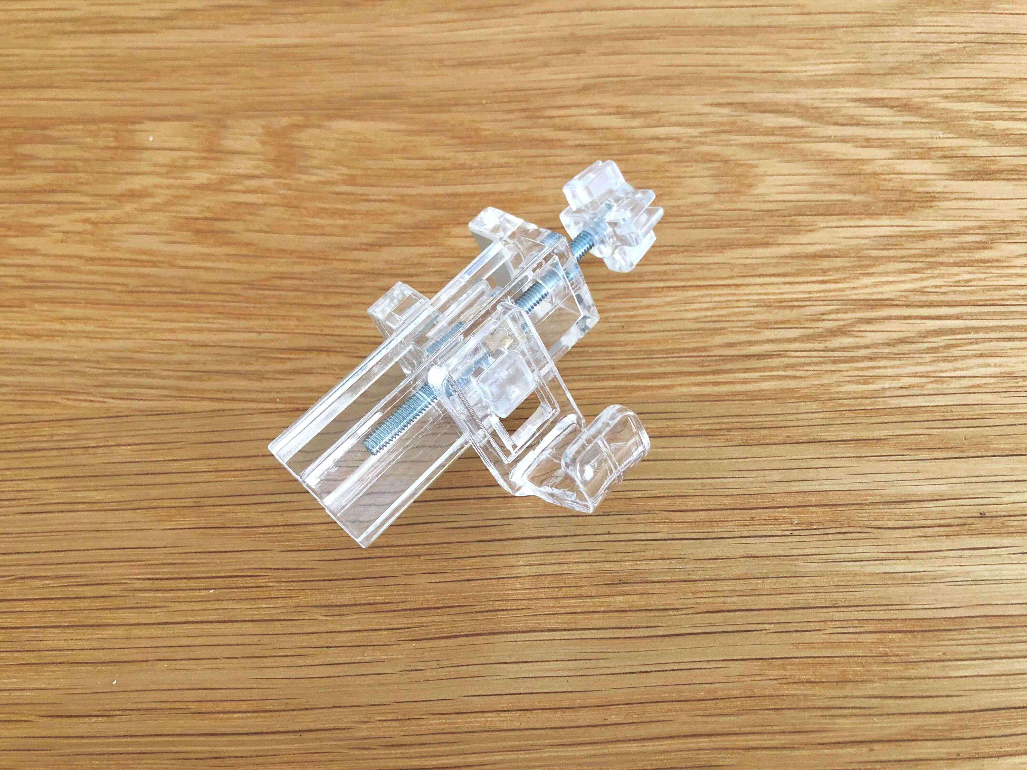 取りつけできるのは、厚さ約10~50mm、奥行き10mm以上の場所で、耐荷重量は約1kgです。
