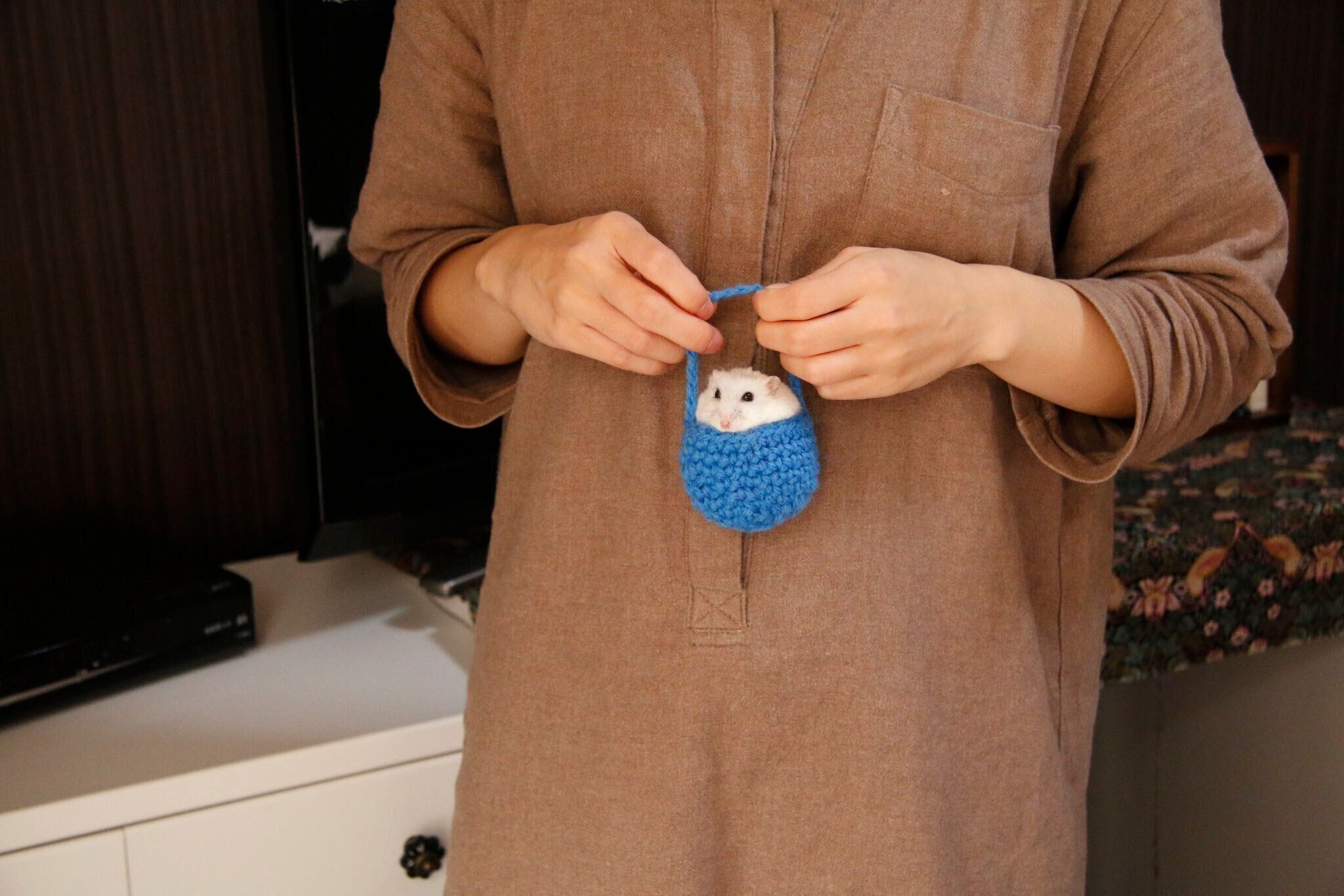 投稿の写真は、ハムスターの入っている青く小さな袋を飼い主さんが丁寧に両手で持っているところを撮ったもの。袋の中にいるのは、ジャンガリアンハムスターのぽん子ちゃんです。