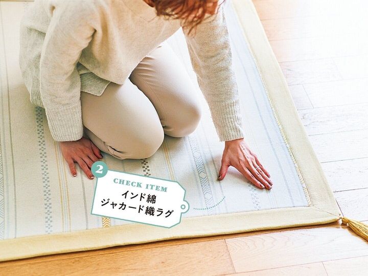 【宇高さん的イイネ!】爽やかカラーのインド綿ジャカード織ラグは、表面がとっても滑らか&クッション性もいい!