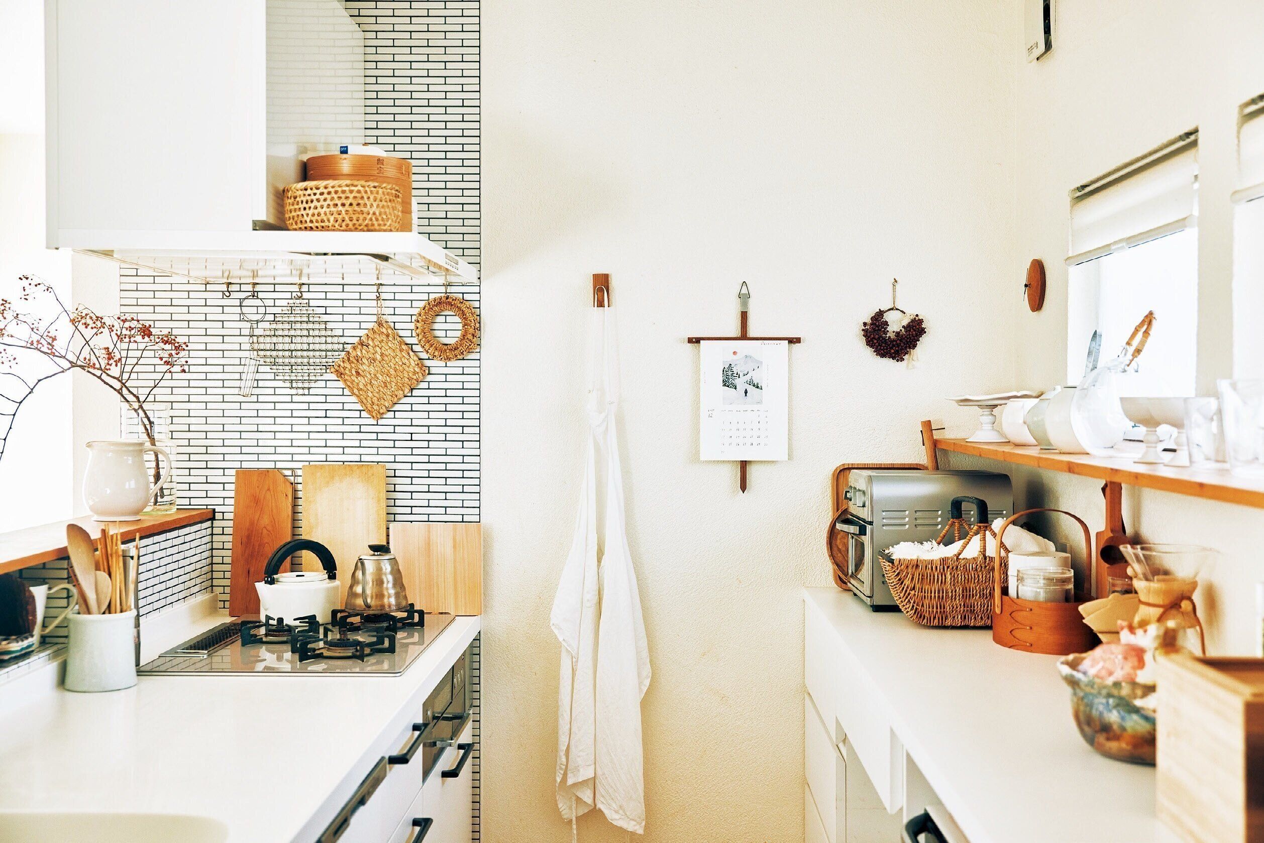 少しずつそろえたお気に入りの道具が並ぶキッチン。使うほどに味わいを増す自然素材のアイテムは、インテリアにもなって一石二鳥。