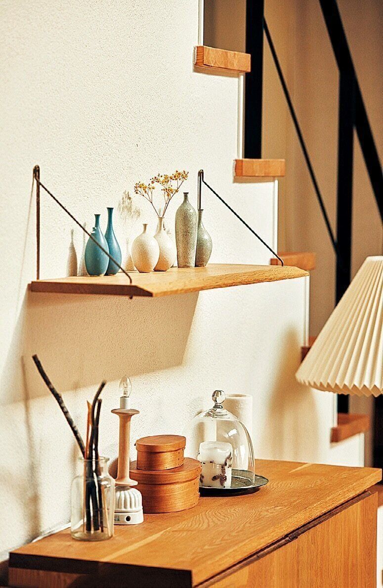 チェストの上をお気に入り雑貨の特等席に。壁にも棚を取り付け、和田麻美子さんの一輪挿しを2つずつ色違いで並べて。余白を生かし、高低差をつけて並べるのがポイント。