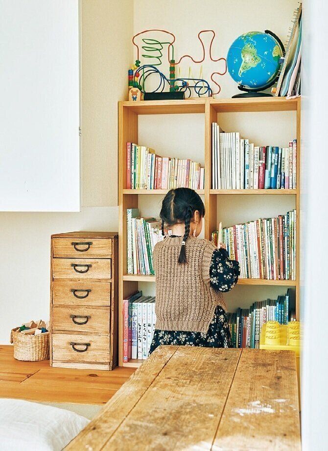 ダイニングの脇にある和室の一角は、絵本やパズルの専用コーナー。リビングから見えない位置に本棚を置けば、少しくらいごちゃついていても気になりません。