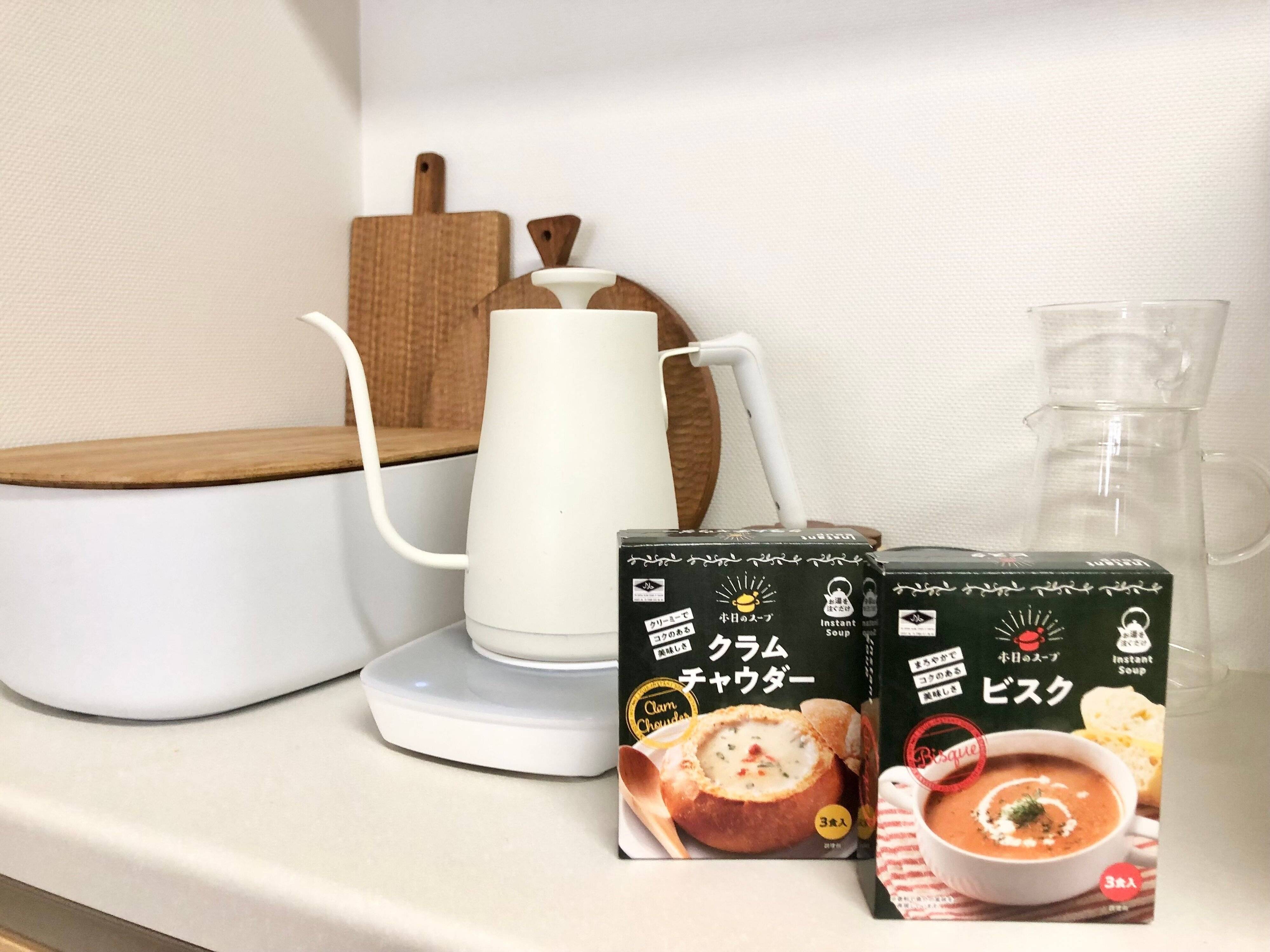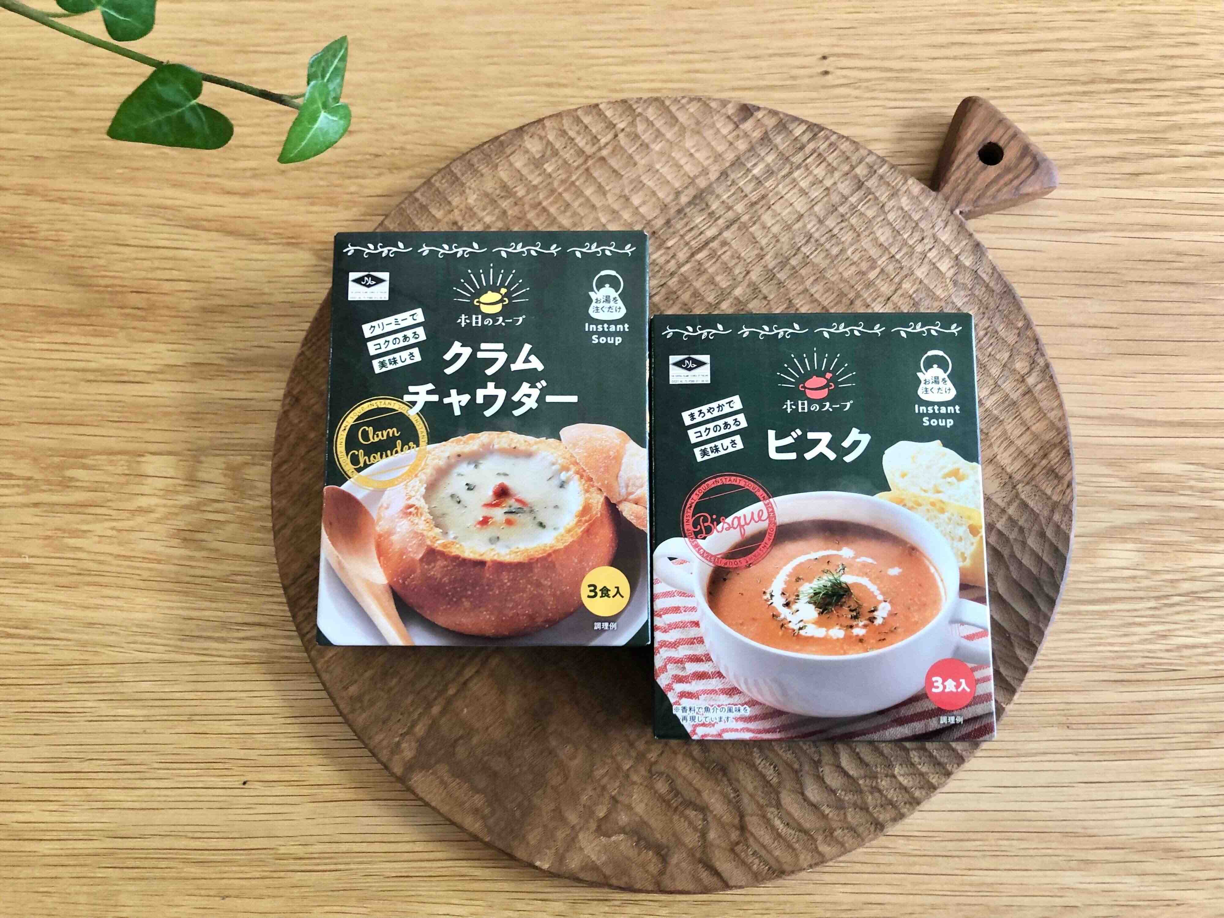 業務スーパーの「本日のスープ」ビスクもクラムチャウダーもどちらも絶品!お湯を注ぐだけでまるでお店レベルの味を楽しめます。