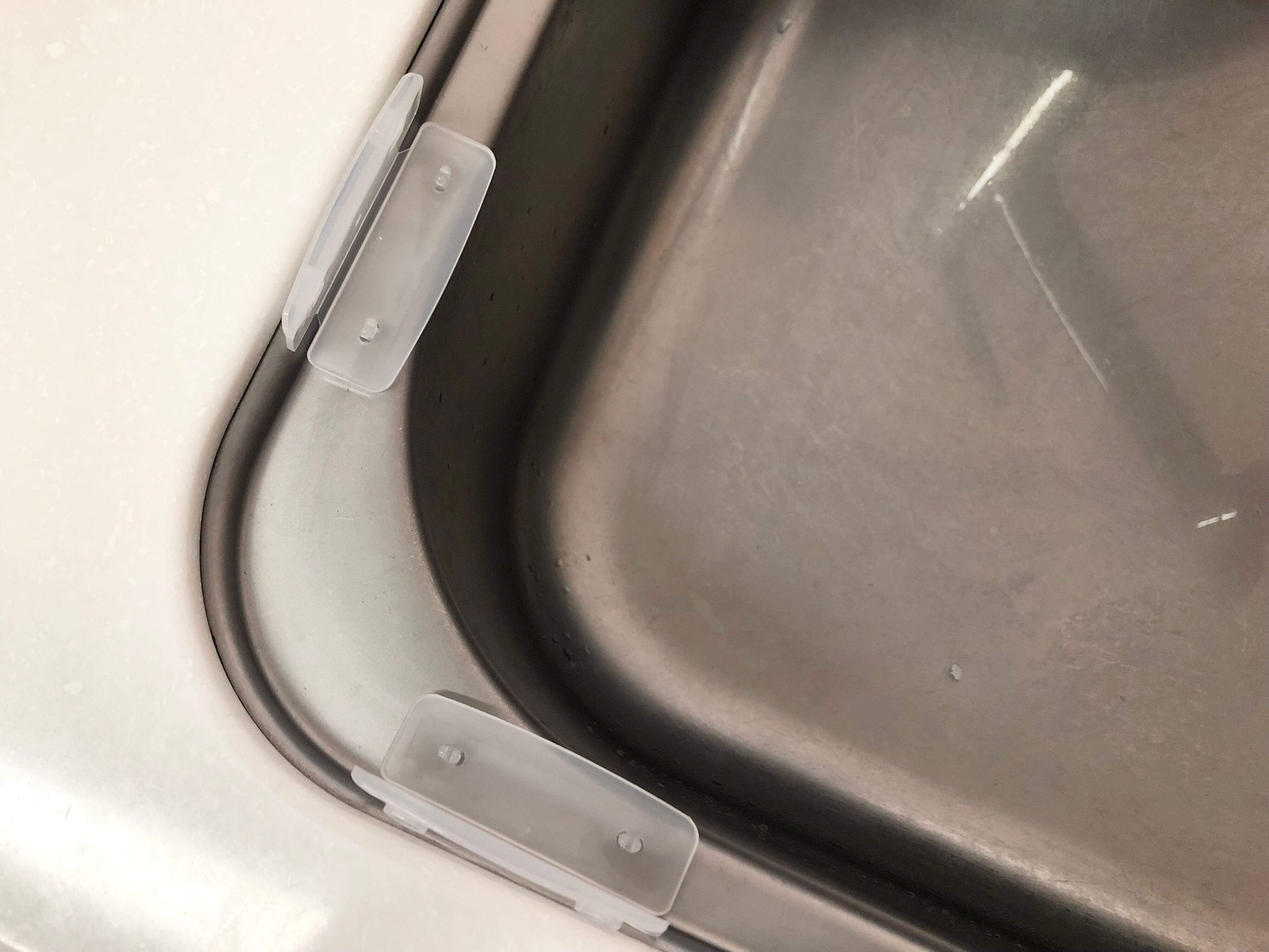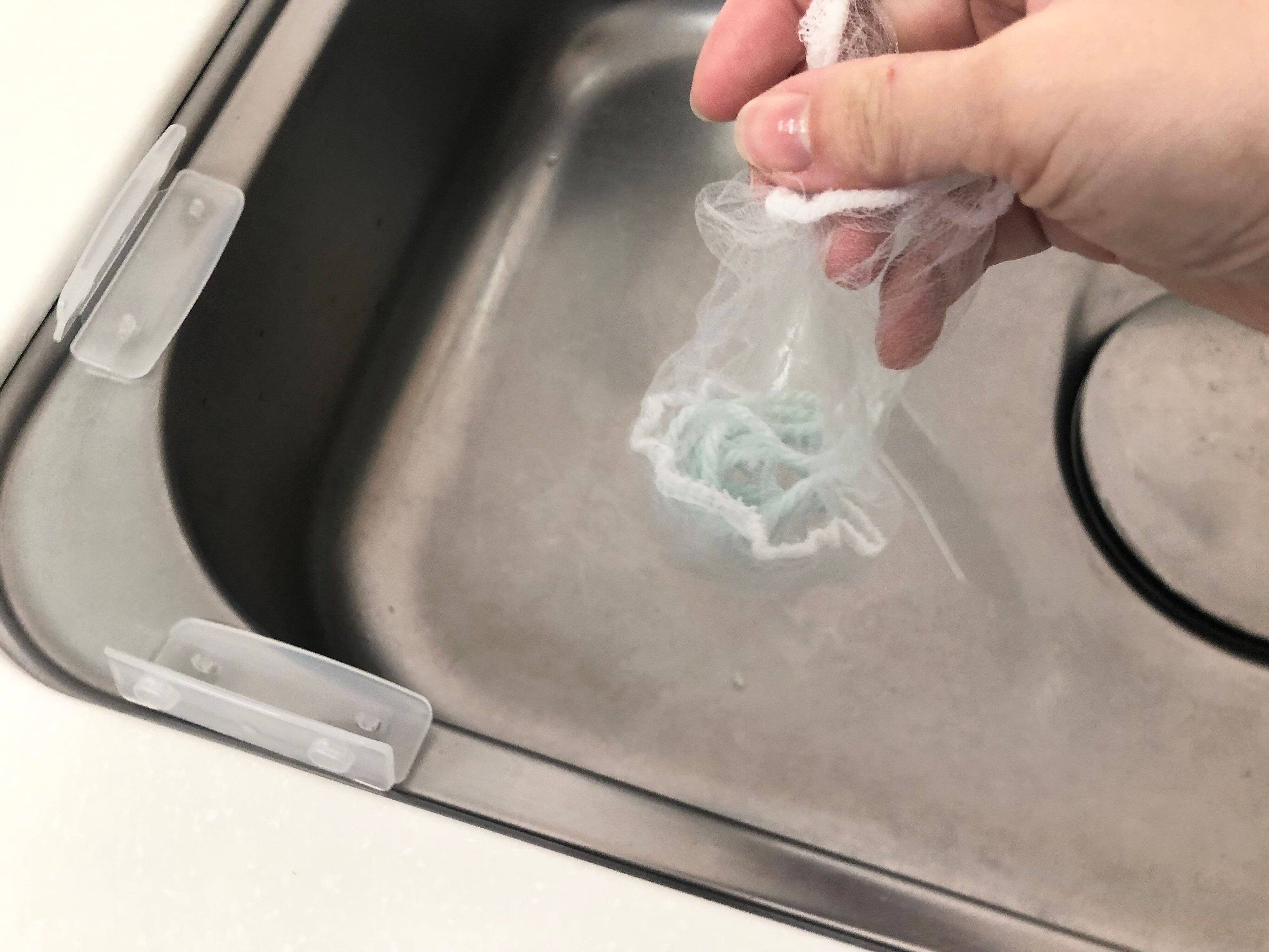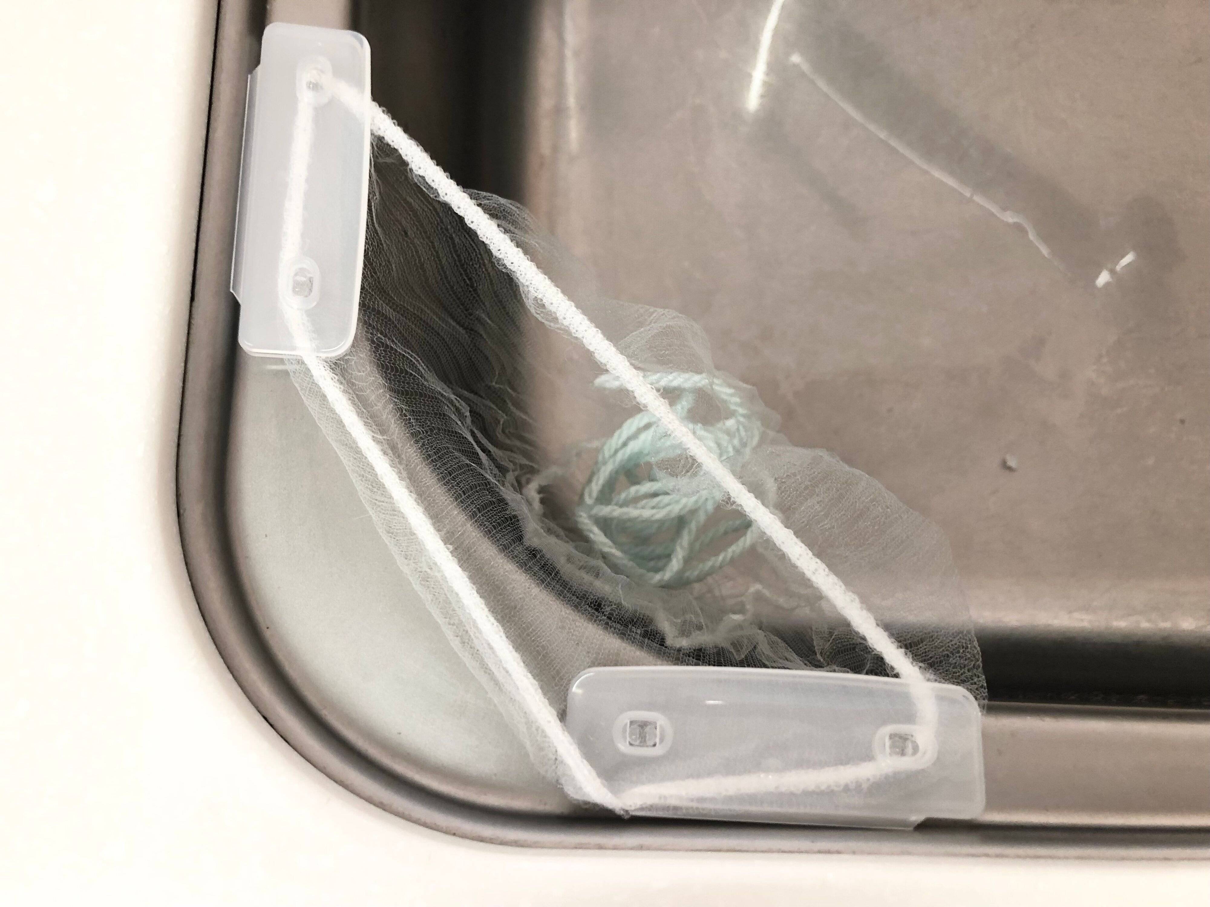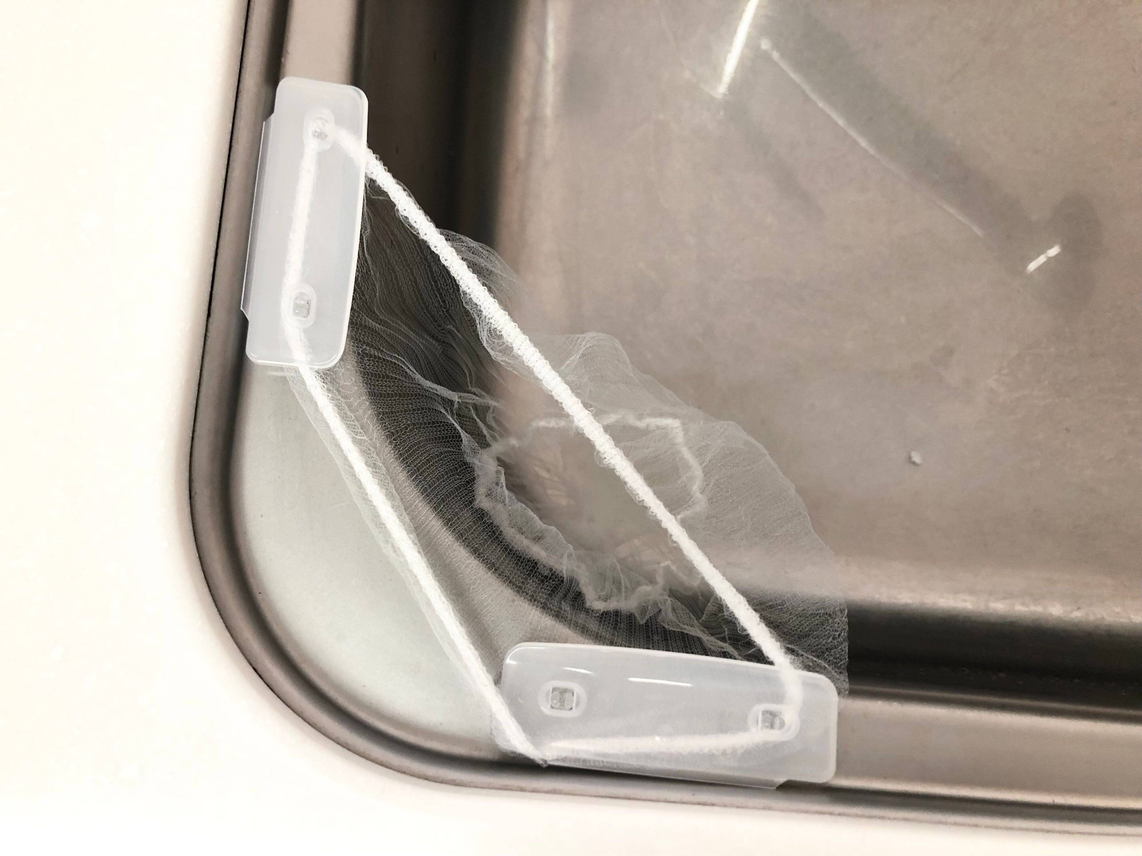 最後にクリップを開いて、水切りネットを挟み込んだら設置完了です。設置しても邪魔にならないぐらいコンパクト!これならシンクを広々と使えるので、食器洗いのときもスムーズに洗えてとっても便利です。