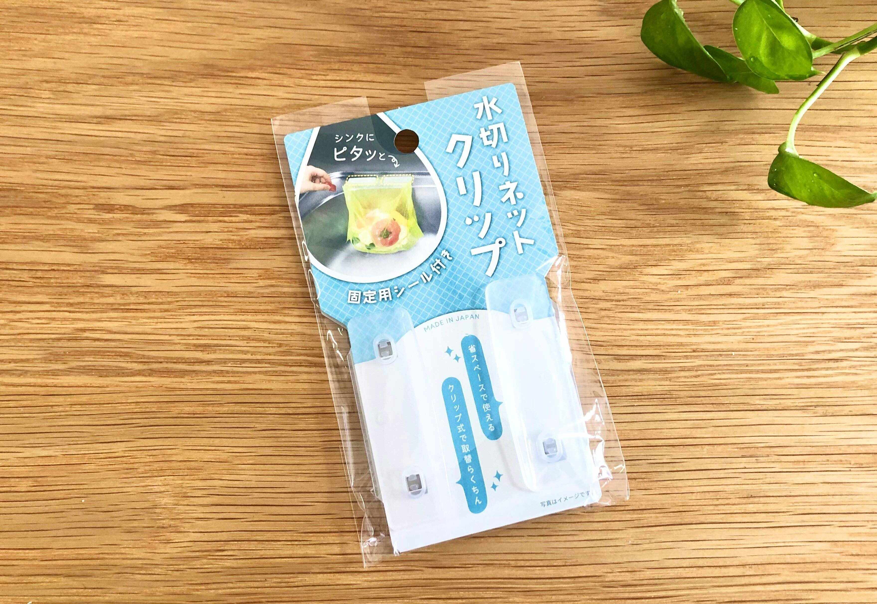 ご紹介するのは、セリアの「水切りネットクリップ 2P」という商品。三角コーナーは便利だから使いたいけど、キッチンのシンクが狭くて置き場所に困るというかたにおすすめの商品です。
