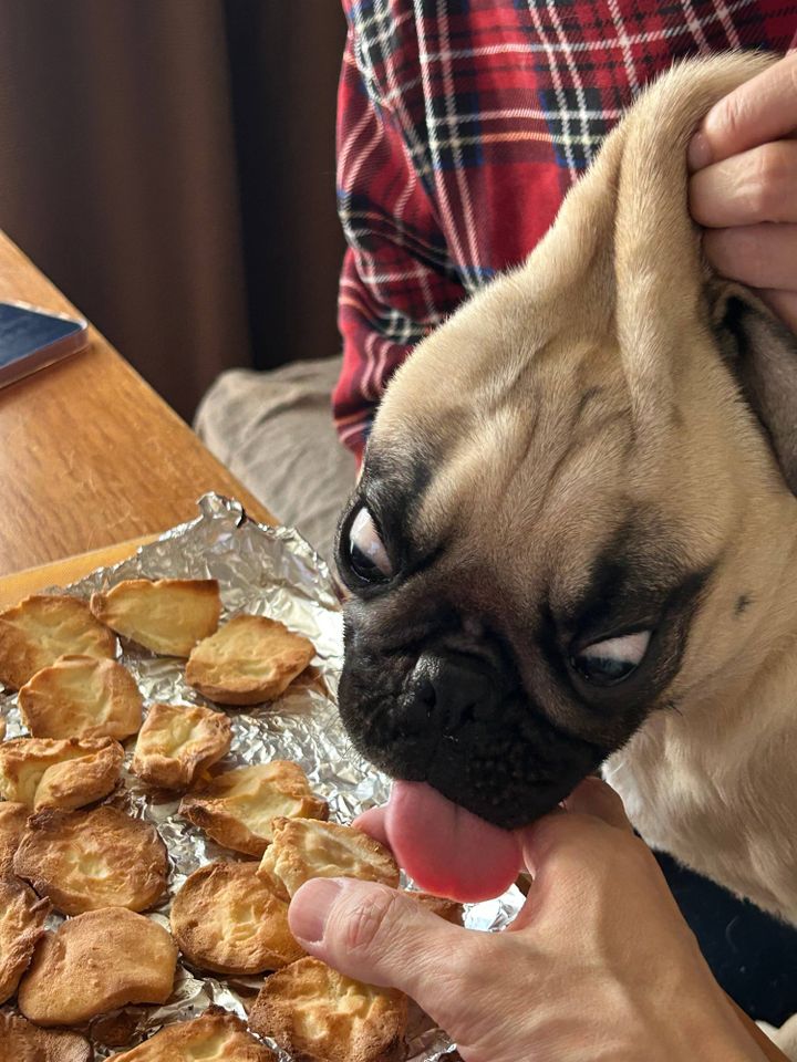 愛犬のシャルルマーニュ(愛称シャルル)くんが隙をついてクッキーをなめようとした、その瞬間がこちら。