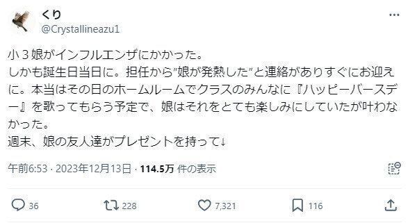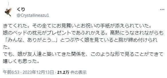 くりさん(@Crystallineazu1)がXに投稿したのは小学生の娘さんの誕生日にまつわるできごと。当日発熱してしまい、楽しみだったイベントを断念せざるを得なかった娘さんでしたが、その後のお友だちの行動によって多くの人の心が温められました。