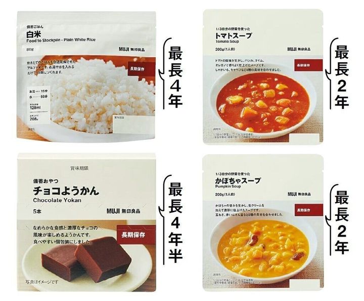 防災アイテムも豊富な無印良品から、保存期間が長く手軽な備蓄フードが登場!熱湯なら15分、水なら60分で完成する白米をはじめ、しっとり食べやすいチョコようかん、野菜不足を補うスープの全4商品です。