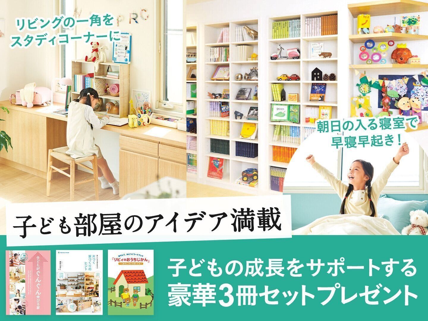 そろそろ子ども部屋を考えたい、マイホームは後悔したくないと思ったら、ぜひご応募を! 子どもが自分の好きを見つけて、伸ばすことができる。自分でやりたい気持ちを育てて、自己肯定感が高まる。早寝早起き、自ら進んでお片づけなど生活習慣が整う…そんな家をつくるための工夫が詰まったお得なカタログ無料プレゼント!