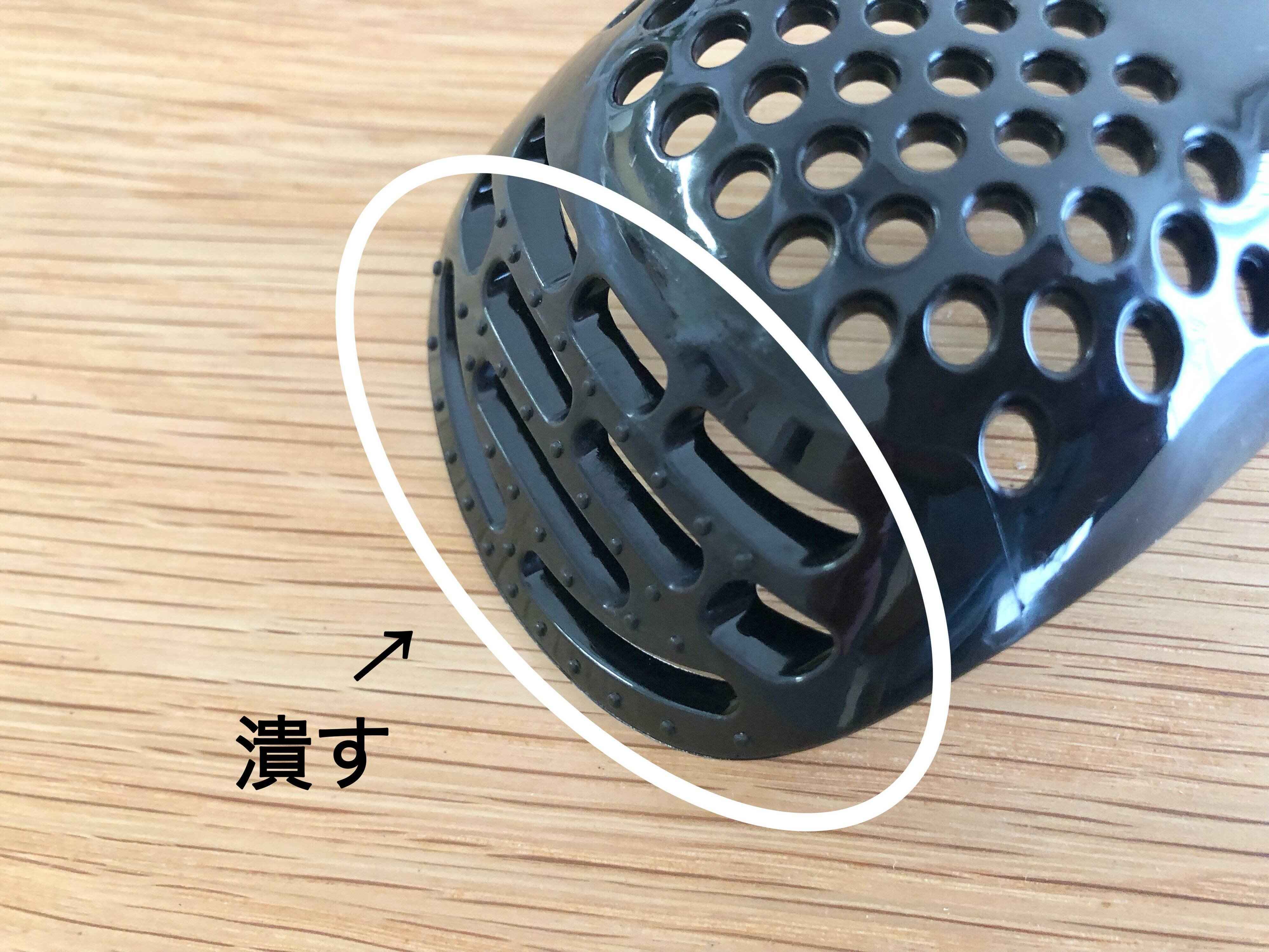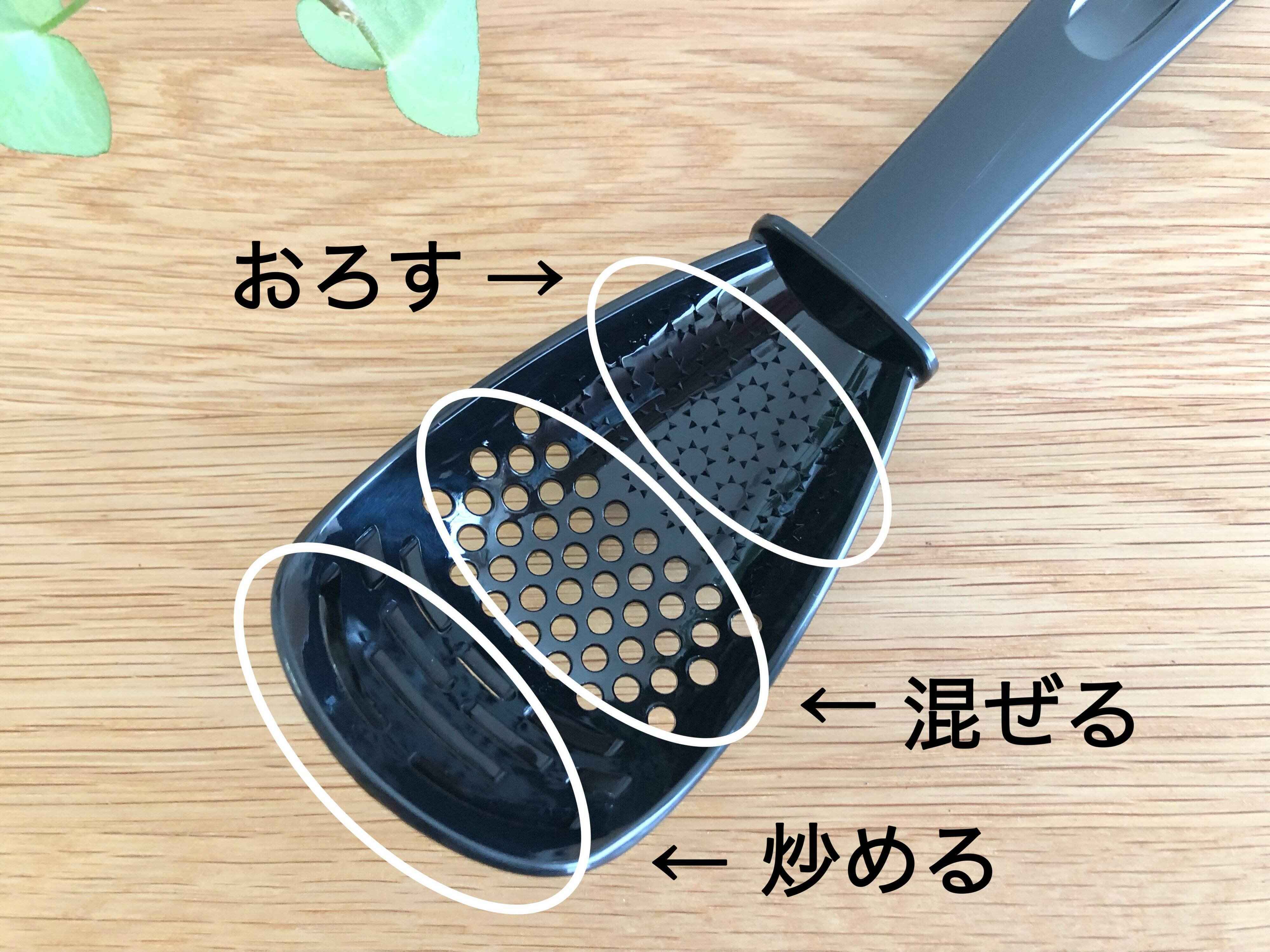 「万能料理スプーン」をよく見ると、穴が空いていたり、突起があったり、少し独特な形状になっています。これは、それぞれの場所が「おろす・潰す・混ぜる・炒める」の4役に適した形状になっているからです。