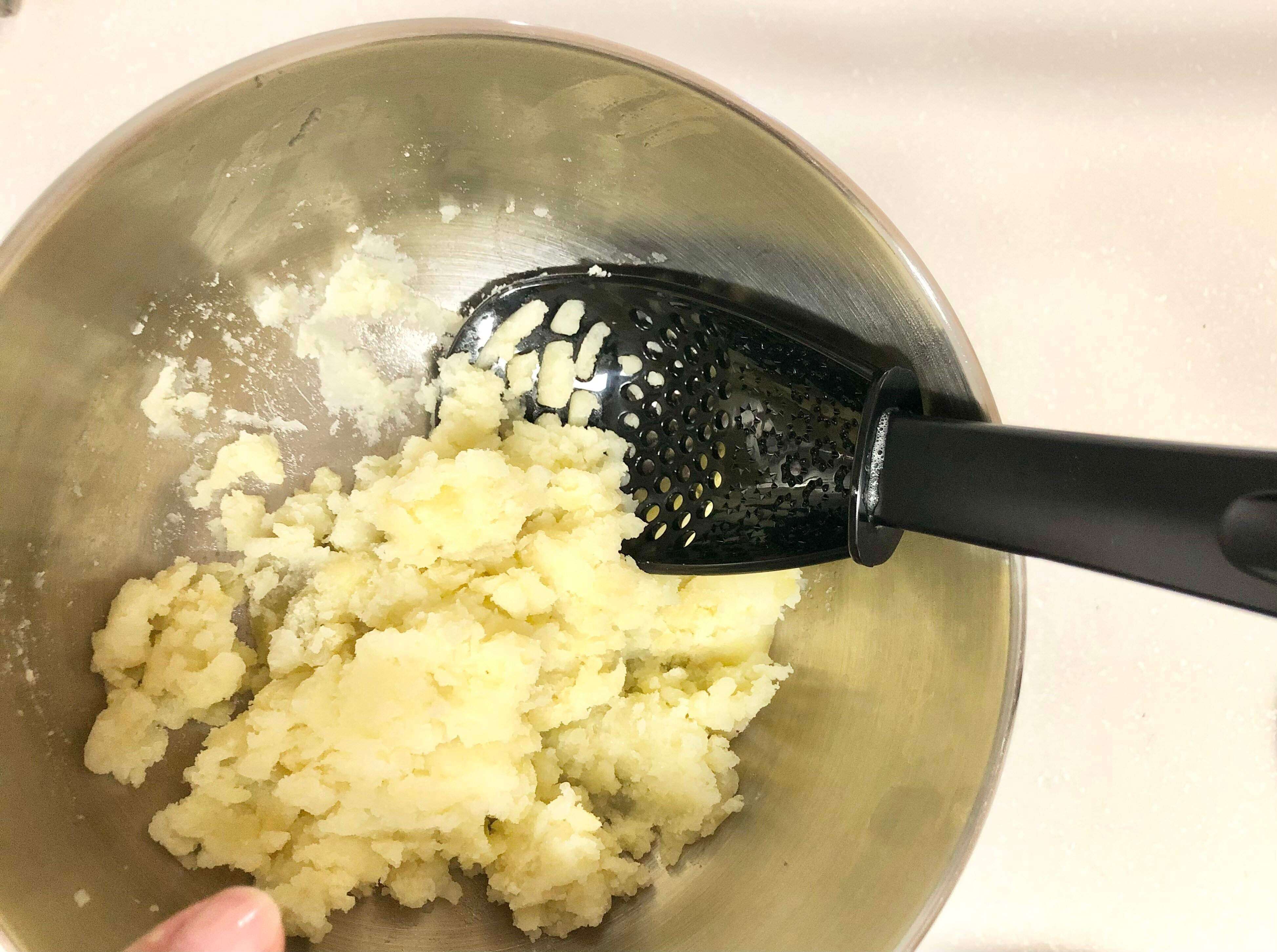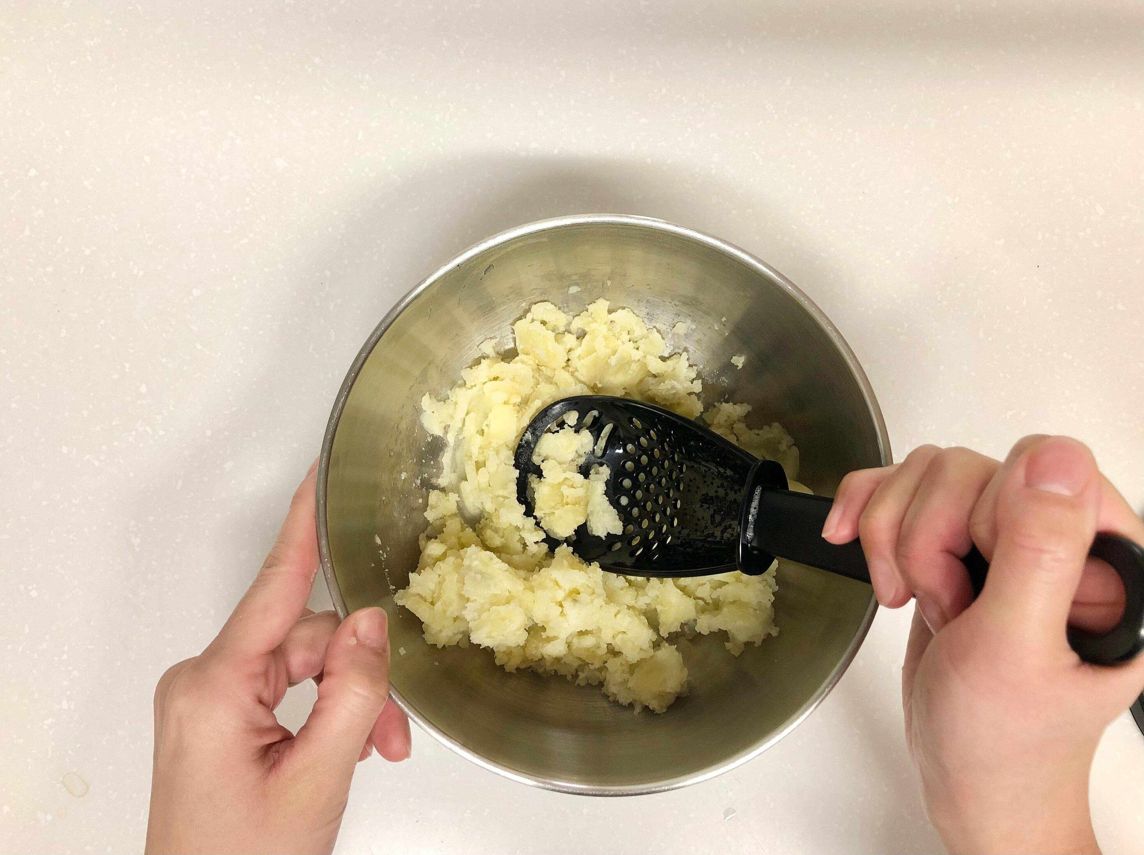 次は「万能料理スプーン」の裏側を使用して、蒸したじゃがいもを潰してみました。