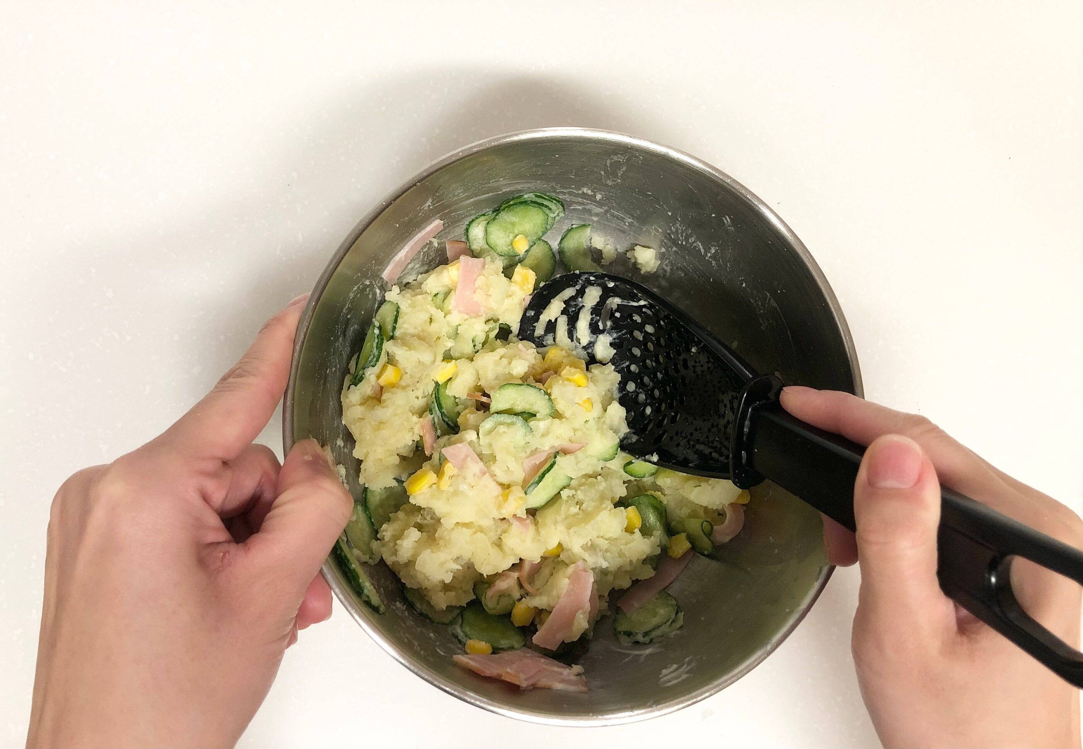 次は先程じゃがいもを潰したので、ポテトサラダをつくってみました。ポテトサラダをつくるとき、ふだんならマッシャーを使ってからヘラなどに交換してから混ぜるんですが、これ1本でそのままスムーズに行えるのがとっても便利!