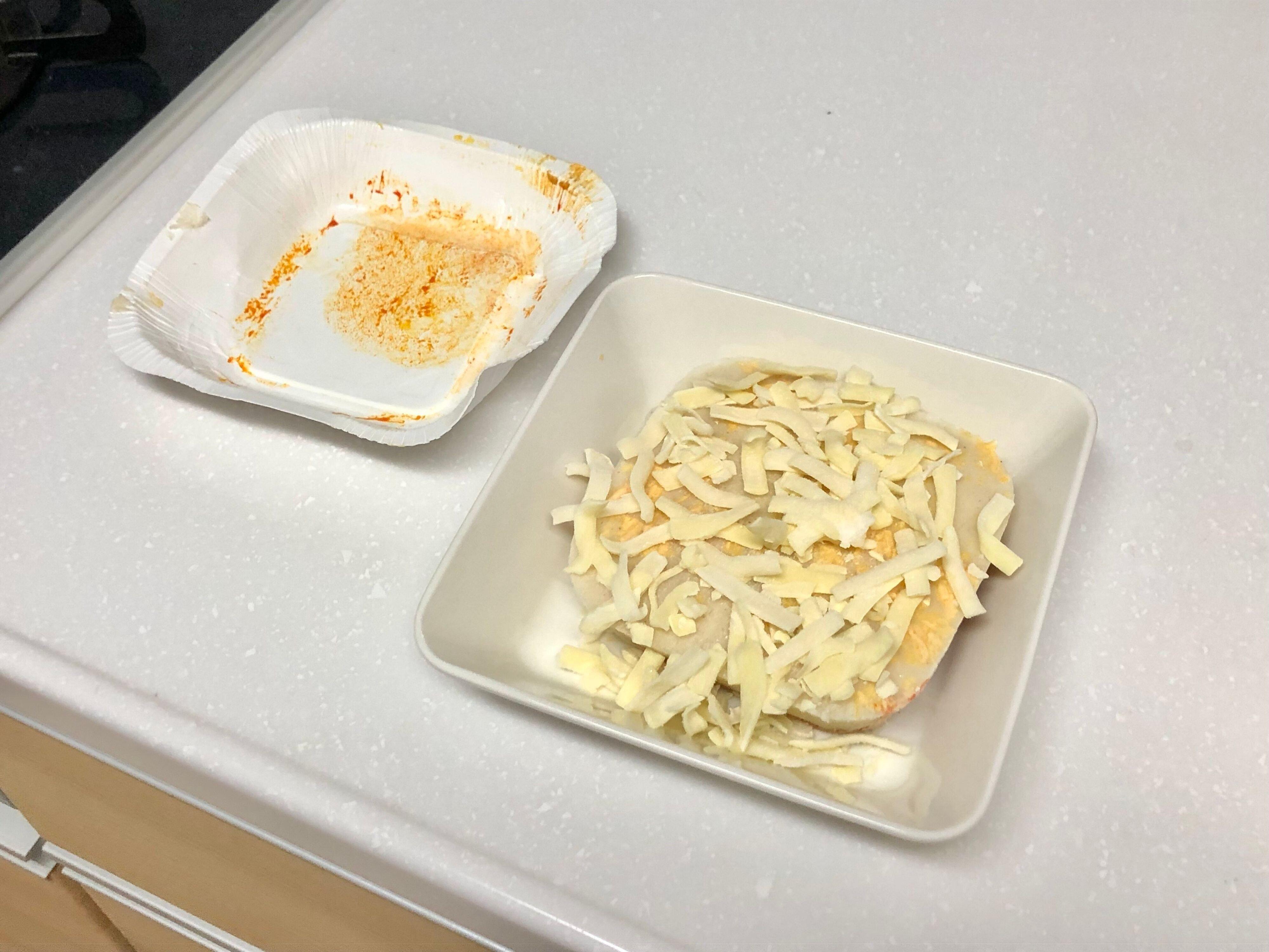 お好みで、チーズを追加します。そのままでも充分おいしいですが、チーズをたすことで、より仕上がったときの見栄えがよくなります。