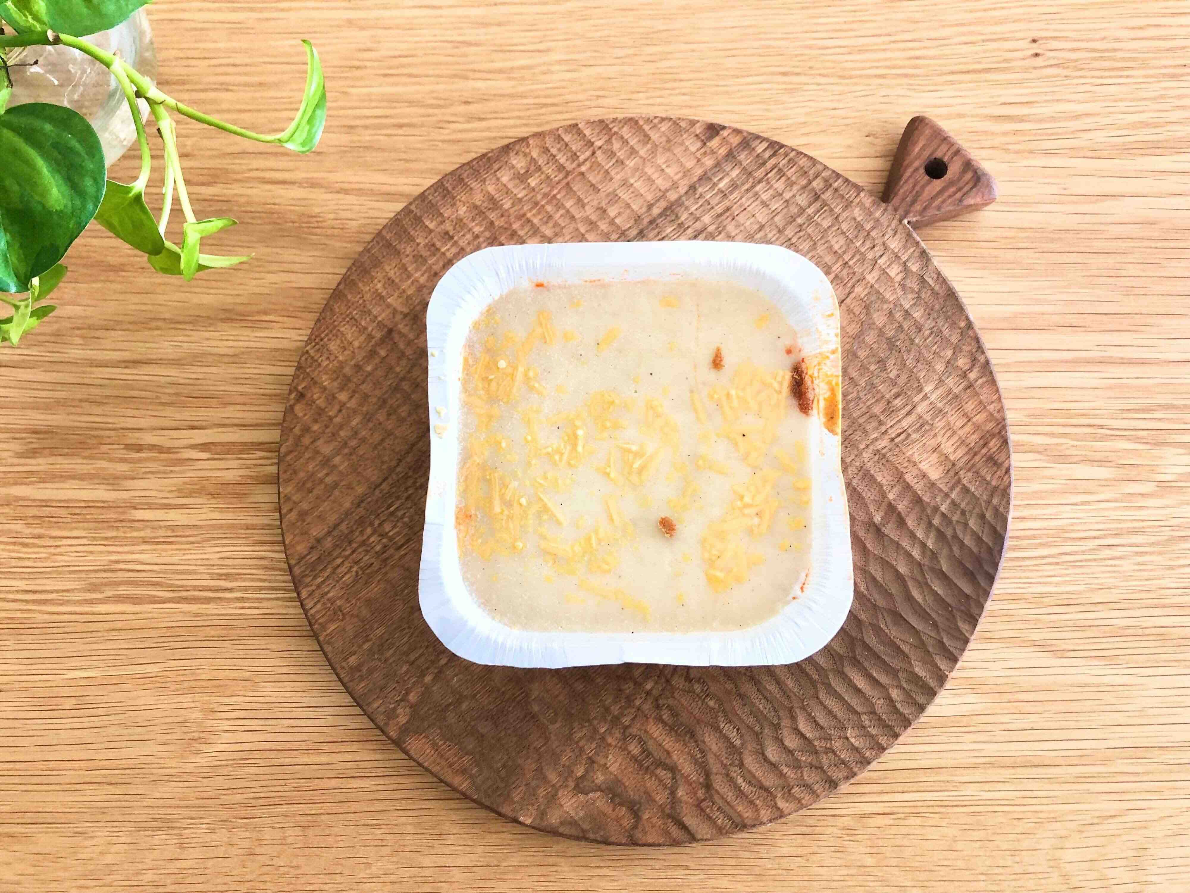 まず容器から、中身を取り出して耐熱皿に移します。耐熱皿の焦げつきが気になるかたは、バターを塗ってから移すほうがいいかもしれません。ちなみに中身自体は冷凍されているので、簡単に取り出すことができます。