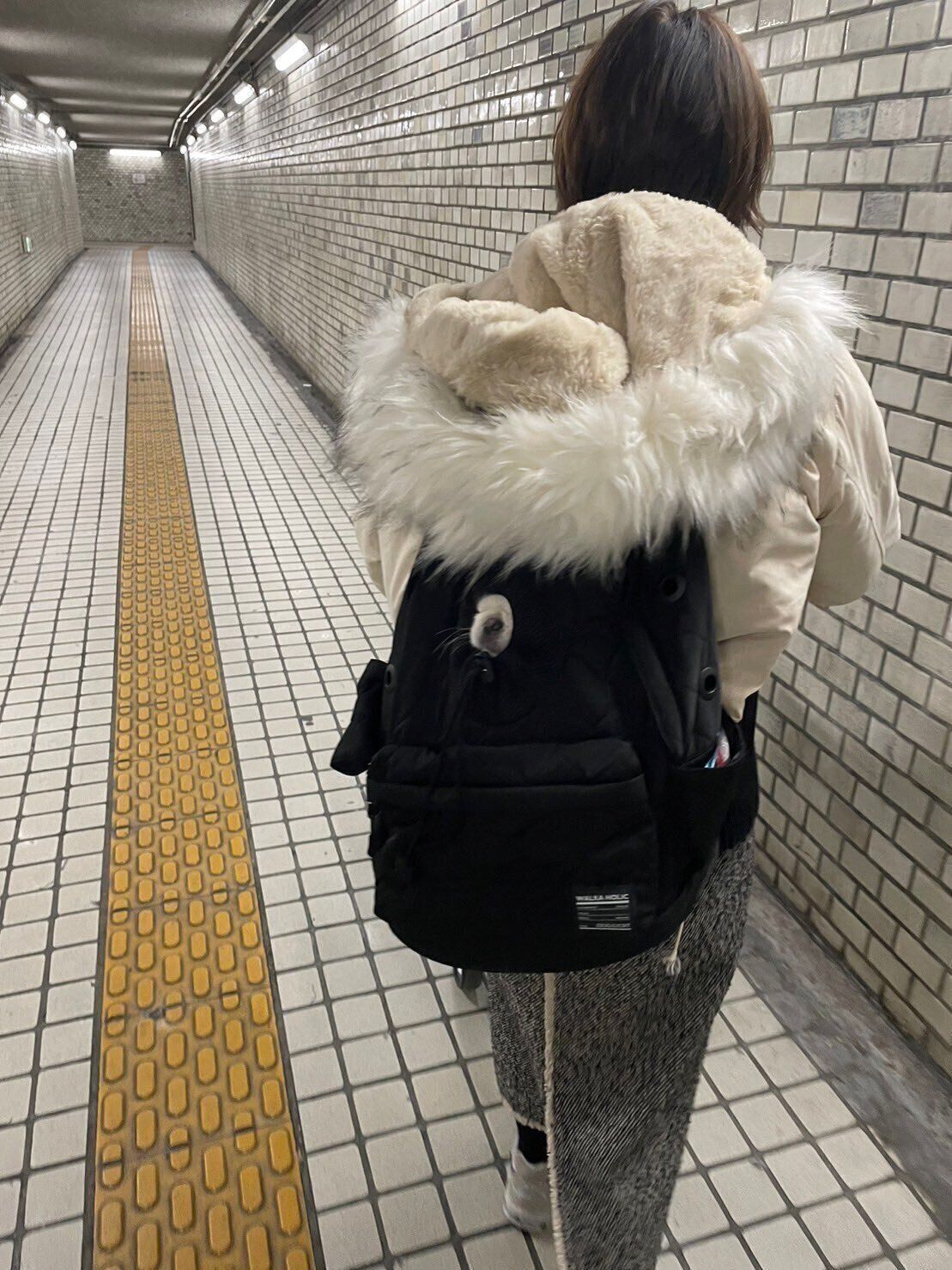 「電車に乗るので顔が出ないように(リュックを)ぎゅっと絞ったら、不服そうに鼻を出していました」