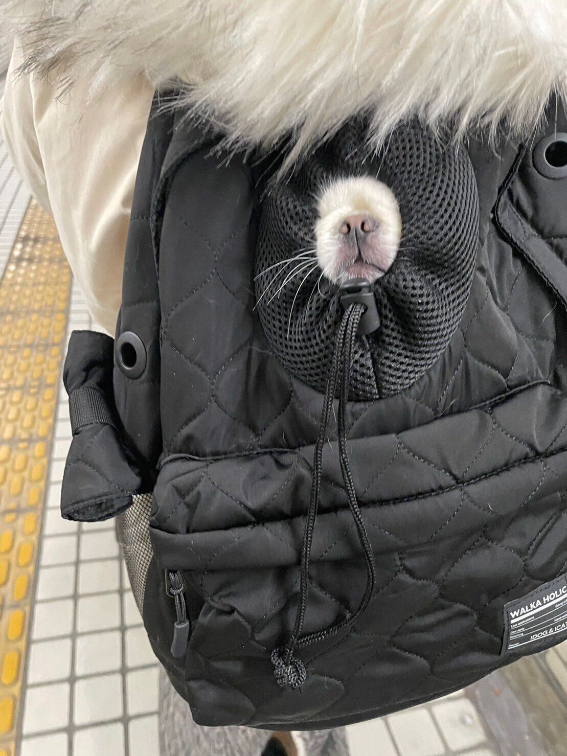 黒いリュックからピョコンと飛び出ているむぎちゃんの鼻が、ユーモアたっぷりで愛おしいですね!