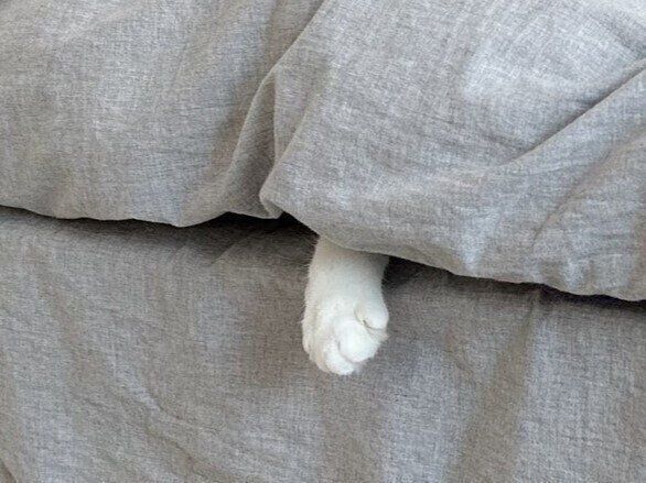 一方、猫の手が写る写真では、人間用の布団の間から小さく白い手がのぞいていました。