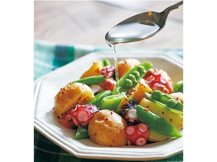 新じゃがは皮ごと食べやすく切り、レンジで火を通す。ゆでたスナップえんどうとボイルたこを食べやすく切る。適量の塩、粒マスタードであえ、太白胡麻油をたっぷりかける