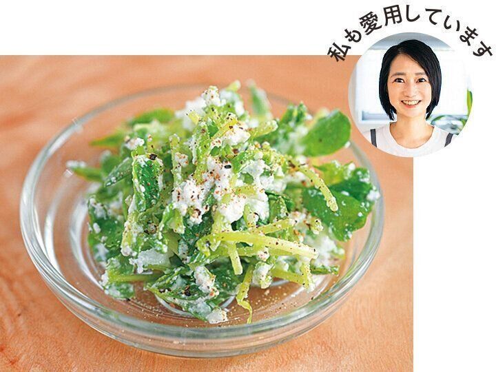 香りの主張がないので、どんな料理にも使えます。豆苗とチーズのあえものは、塩、こしょうと太白胡麻油だけでこくが出ておいしい