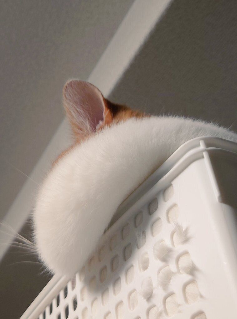 「おちゃまるお気に入りのカゴを高い場所に設置しているのですが、そのカゴの縁にほっぺたを乗せて寝るのが一番落ち着く寝方のようで。その様子を下から激写しました」