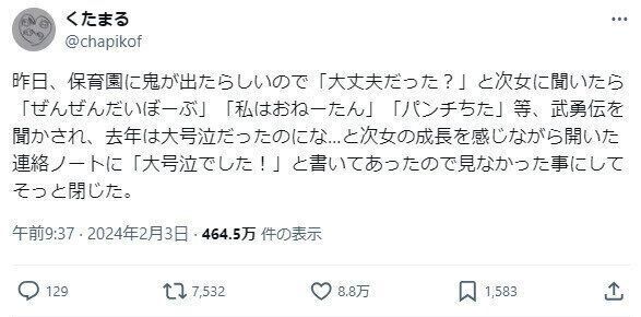 くたまるさん(@chapikof)が投稿したのは、3歳の次女ちゃんが保育園で鬼に出会ったときのできごと。強気な態度でがんばった次女ちゃんでしたが、その後明かされた事実に多くの人が癒やされ、8.8万件以上のいいねが集まりました。