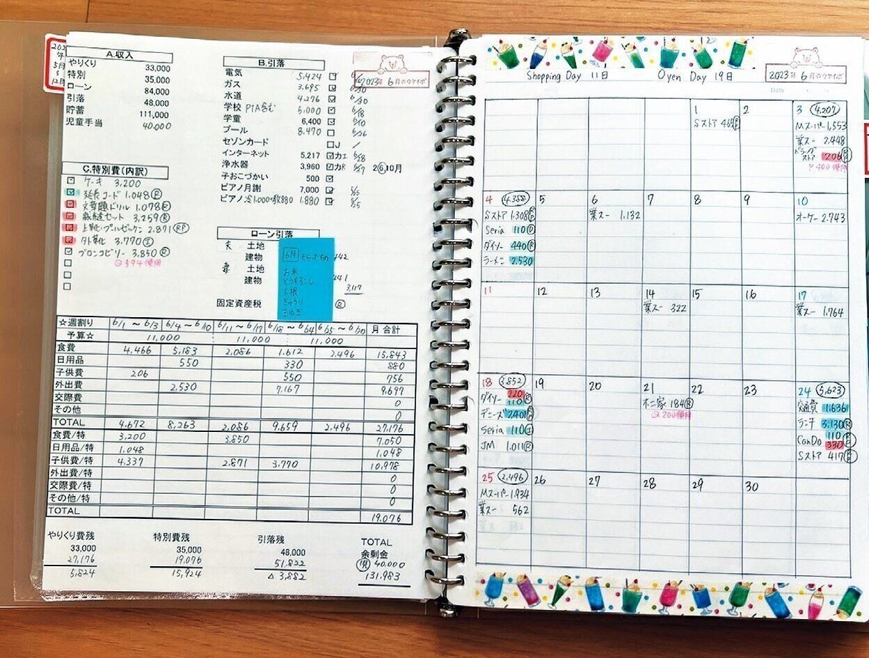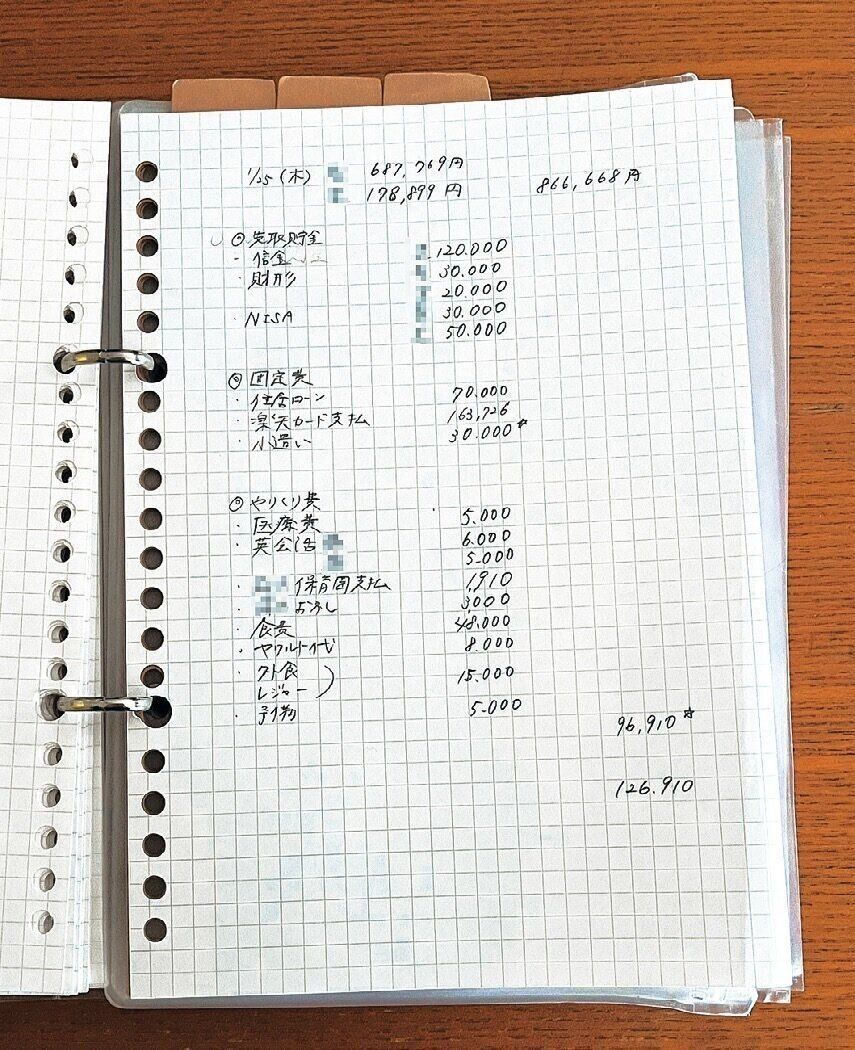 月の収支表を貼ったルーズリーフをB5サイズのバインダーにまとめ、一目で見やすく