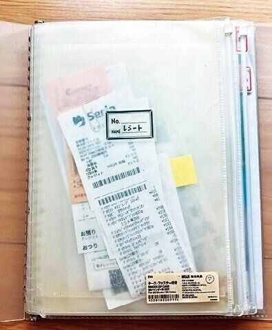 家計簿に未記入のレシートやカード利用明細は、「EVAケース B5バインダー用」に一時保管。記入漏れを防いでいます。