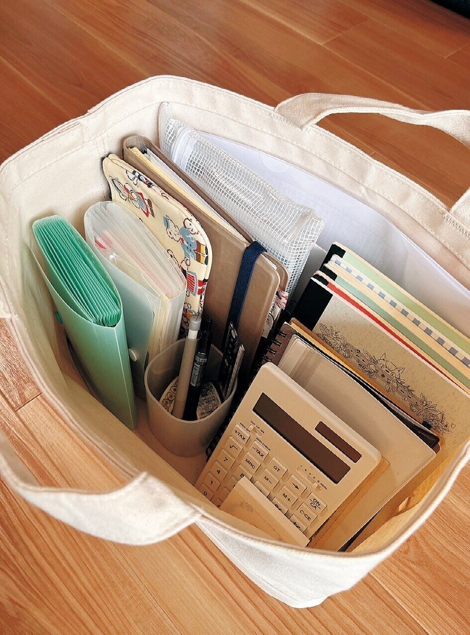 「習い事代、衣服代、医療費、クレジット用の予算を無印良品の『片面クリアケース』に分けることで、使い過ぎ予防に。クリアケース、電卓、週予算を入れた蛇腹ケースを『持ち手付帆布長方形バスケット』(★)にまとめています」