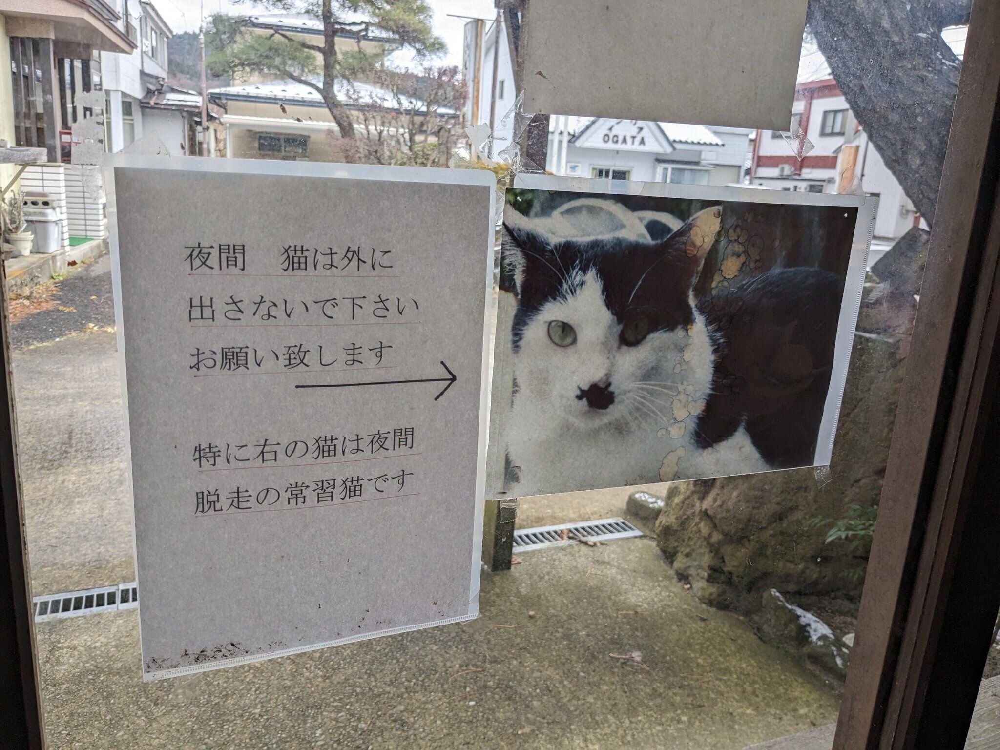 ガラス面には何枚もの貼り紙もありました。こちらの建物は宿泊施設のようで、宿泊者への門限や駐車場の案内などが掲示されているのが確認できます。中には大きく引き伸ばされたネコちゃんの写真も。
