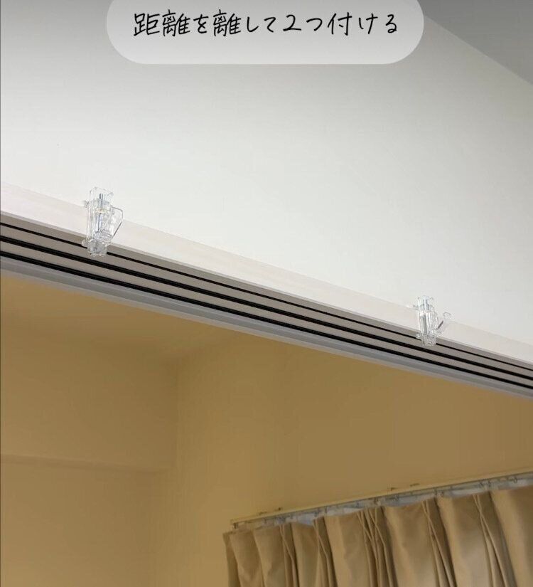 設置方法はとても簡単!まず、ダイソーの「縦にも横にもはさめるかもいフック」(110円)2つを、かもい部分に離して取りつけます。